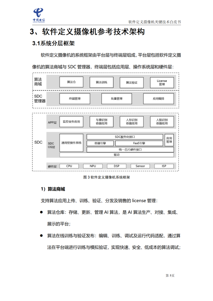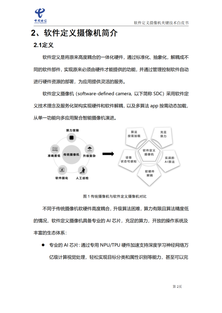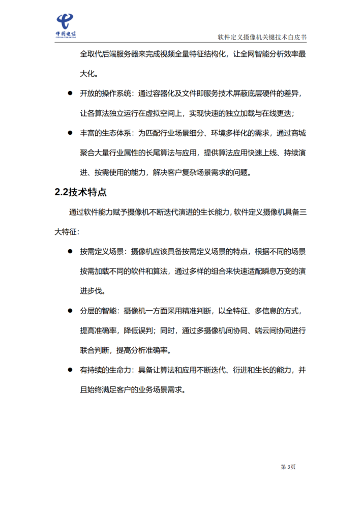 摄像机终端厂商、芯片厂商正与运营商携手推进“软件定义摄像机”的全新理念,以专业Al芯片、开放的操作系统、丰富的生态体系来定义智能摄像机的全新架构,按需定义用户场景、实现分层智能及持续更新算法,使得摄像机拥有可持续的生命力。