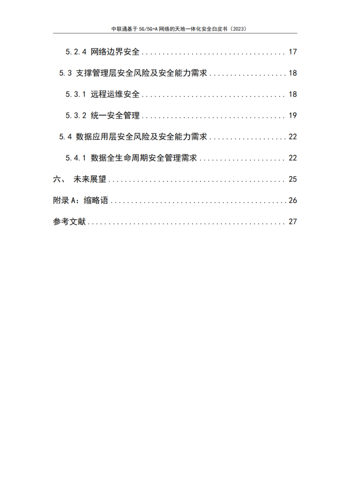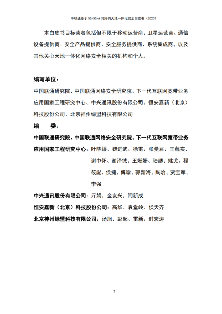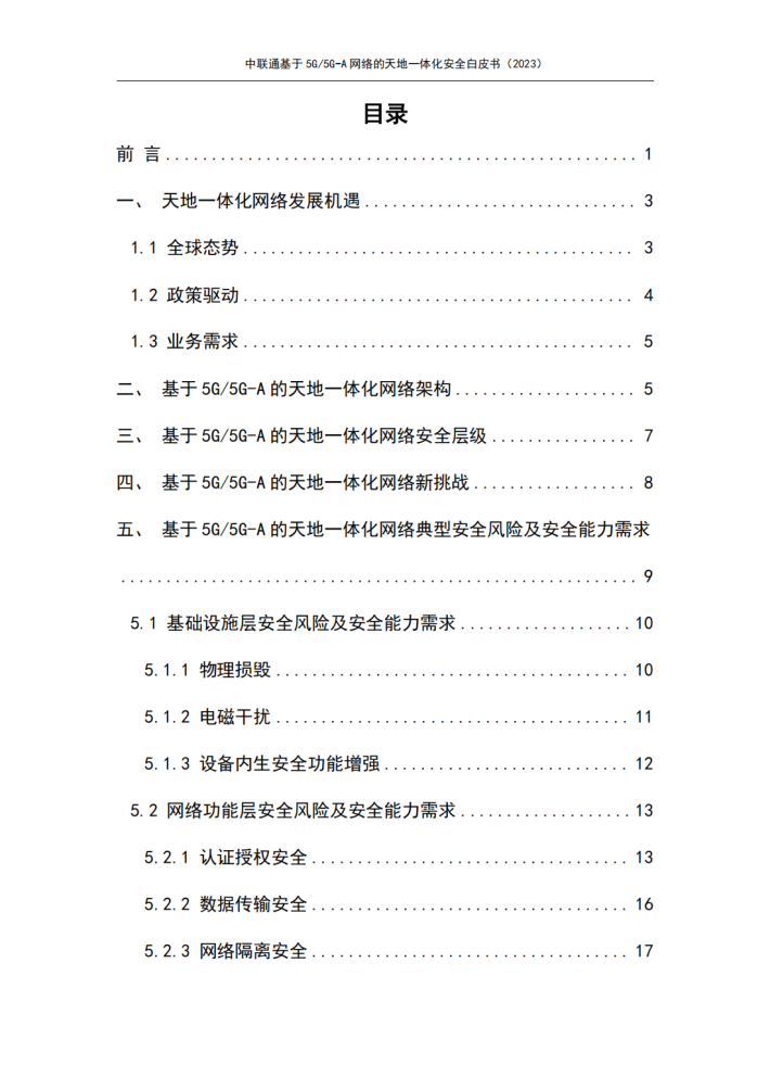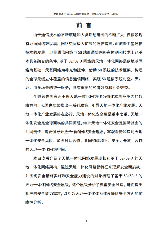 本白皮书介绍了天地一体化网络发展现状和基于5G/5G-A的天地一体化网络架构,通过天地一体化网络新特征来理解安全新挑战,并围绕安全措施实施和安全能力建设的对象梳理了基于5G/5G-A的天地一体化网络安全层级,逐个层级分析了典型安全风险,进而提出相应的安全能力需求,以期为天地一体化体系建设提供安全方面的前瞻性分析。