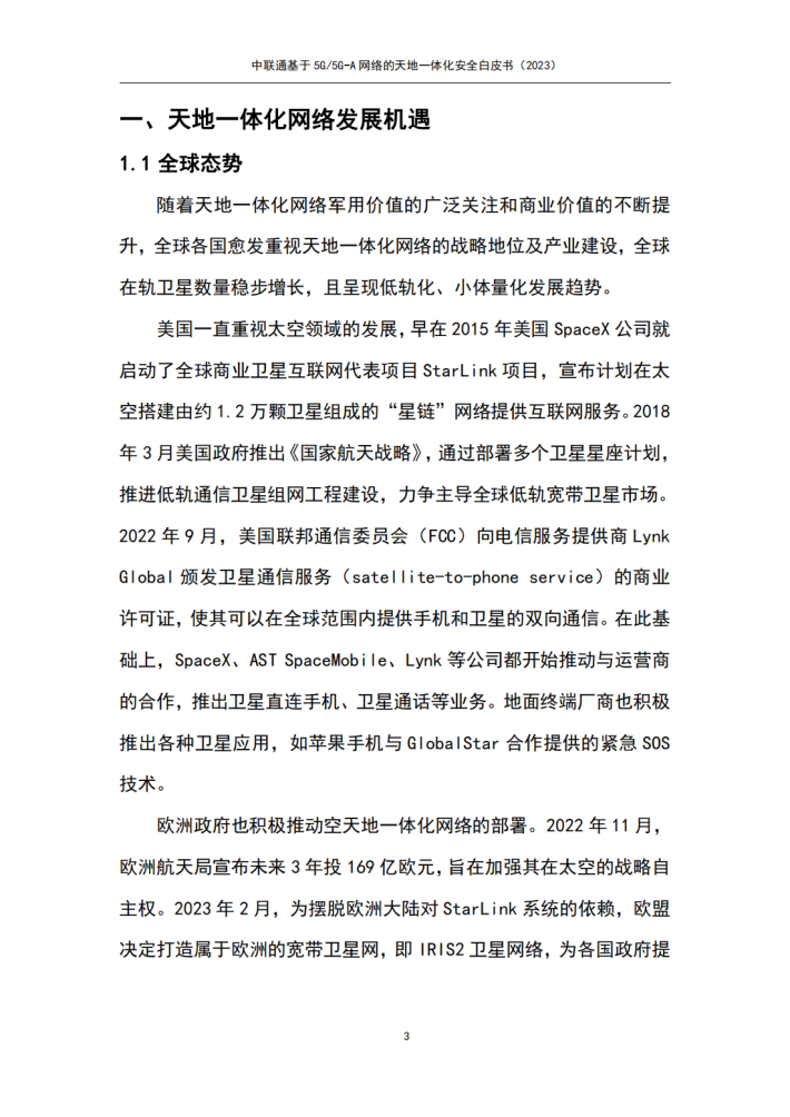 全球领先国家无不将天地一体化网络作为强化本国竞争力的战略方向,我国也陆续推出一系列政策,引导天地一体化产业发展。天地一体化产业发展势在必行,天地一体化安全更是重中之重,天地一体化安全是全球面临的共同问题,维护天地一体化安全是国际社会的共同责任,需要倡导开放合作的网络安全理念,客观看待和应对天地一体化安全风险,加强对话合作,共同构建和平、安全、开放、合作的天地一体化网络空间。