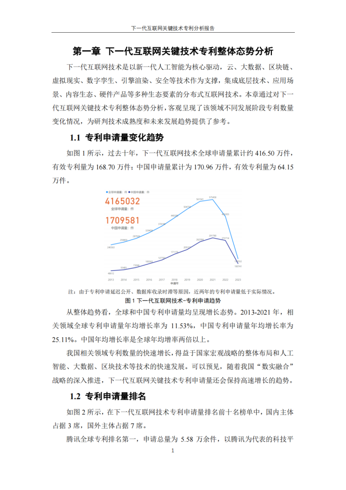 从目前来看,下一代互联网很可能加速数字化生产力、生产资料和生产关系的全面升级与变革。AI将成为重要的生产工具,将大幅提升数字化生产力水平,并且倒逼大量的人类生产者改变相关职业和技能;大数据作为新型的关键生产要素将成为共识,更多维的数据涌现,数据的有效流通与价值变现将成为可能;云技术、虚拟现实、区块链等技术应用也已融入到社会生活的方方面面,这为我国下一代互联网技术高水平发展提供了重要机遇。由于专利数据具有法律性、技术性以及经济性属性,同时,也能对技术先进性、产业发展方向等进行表征,因此,如何应用好专利数据信息,挖掘技术热点和空白点,帮助我国创新主体抢占下一代互联网关键技术全球发展制高点成为迫在眉睫的事情。