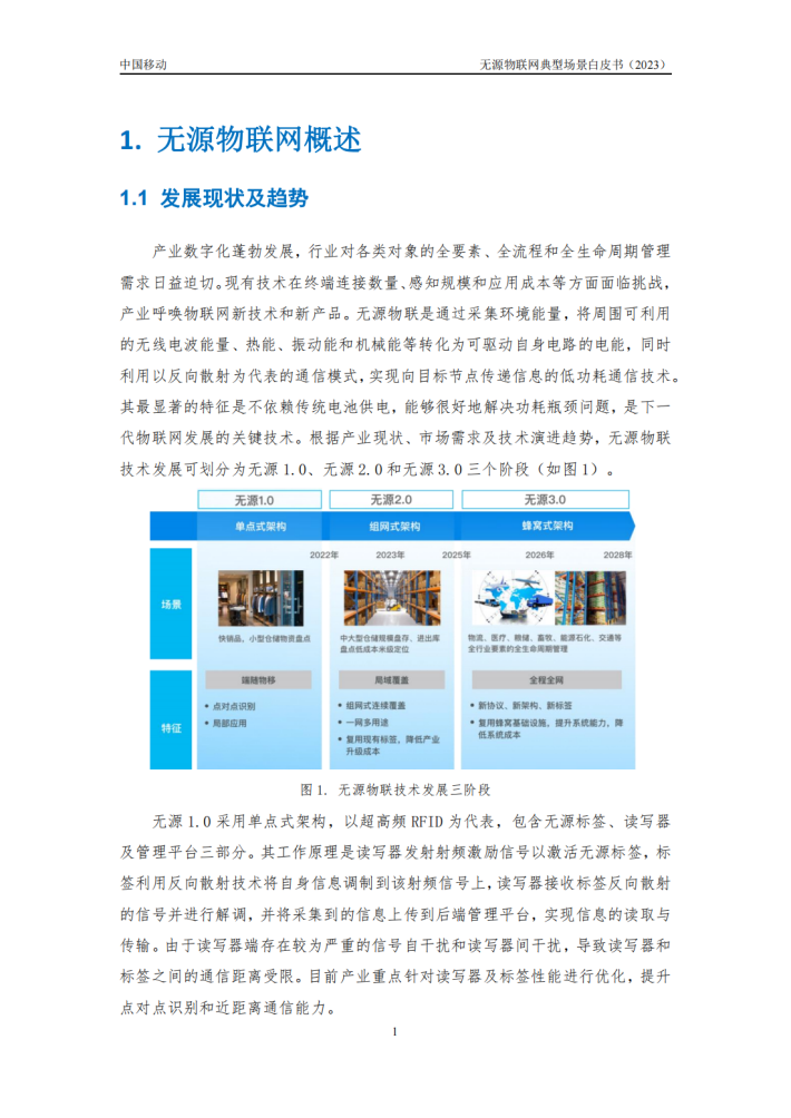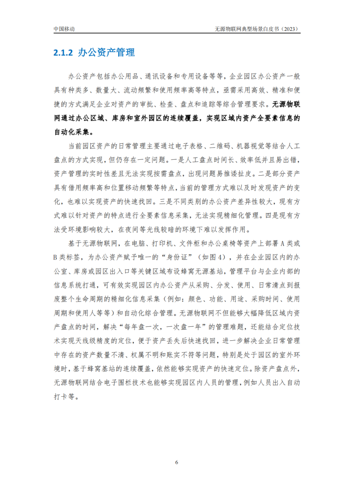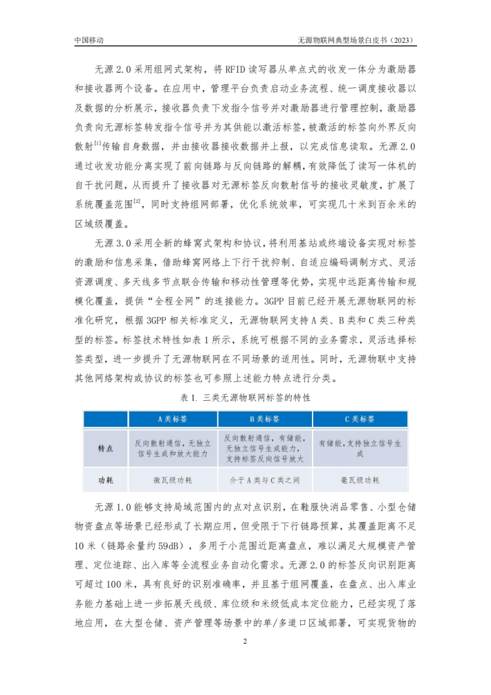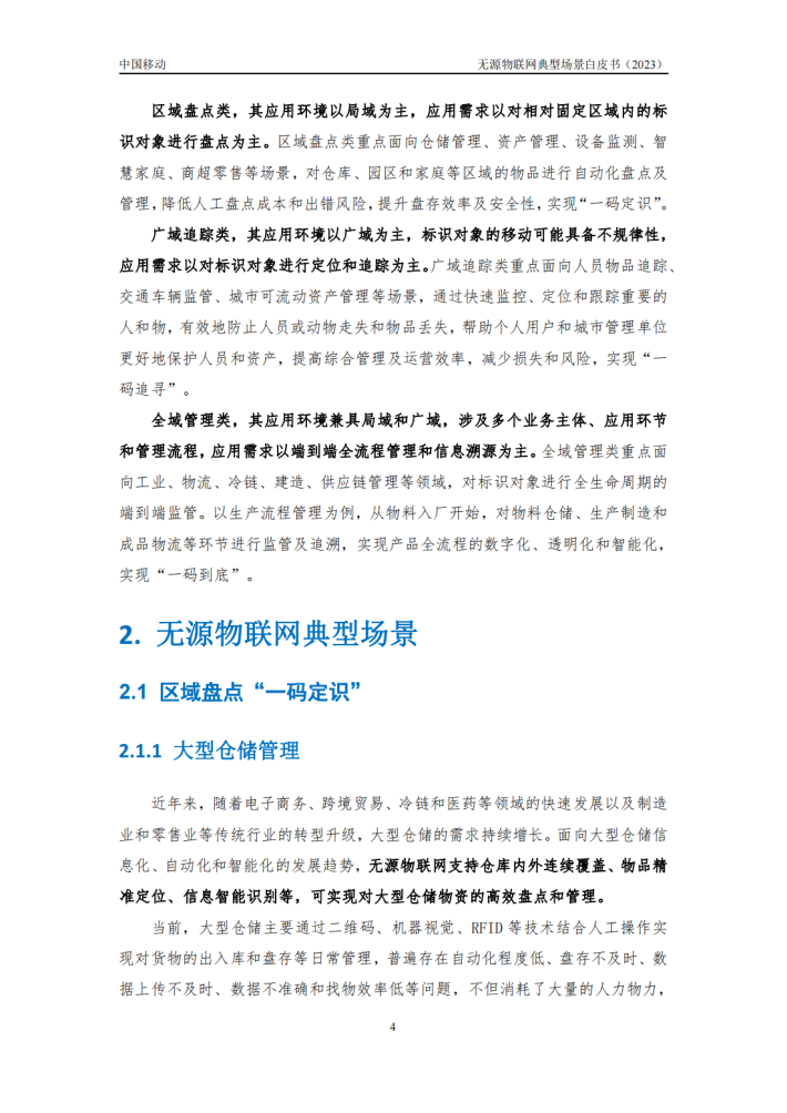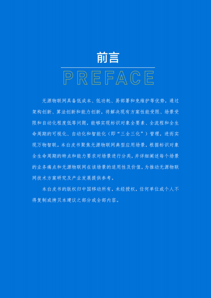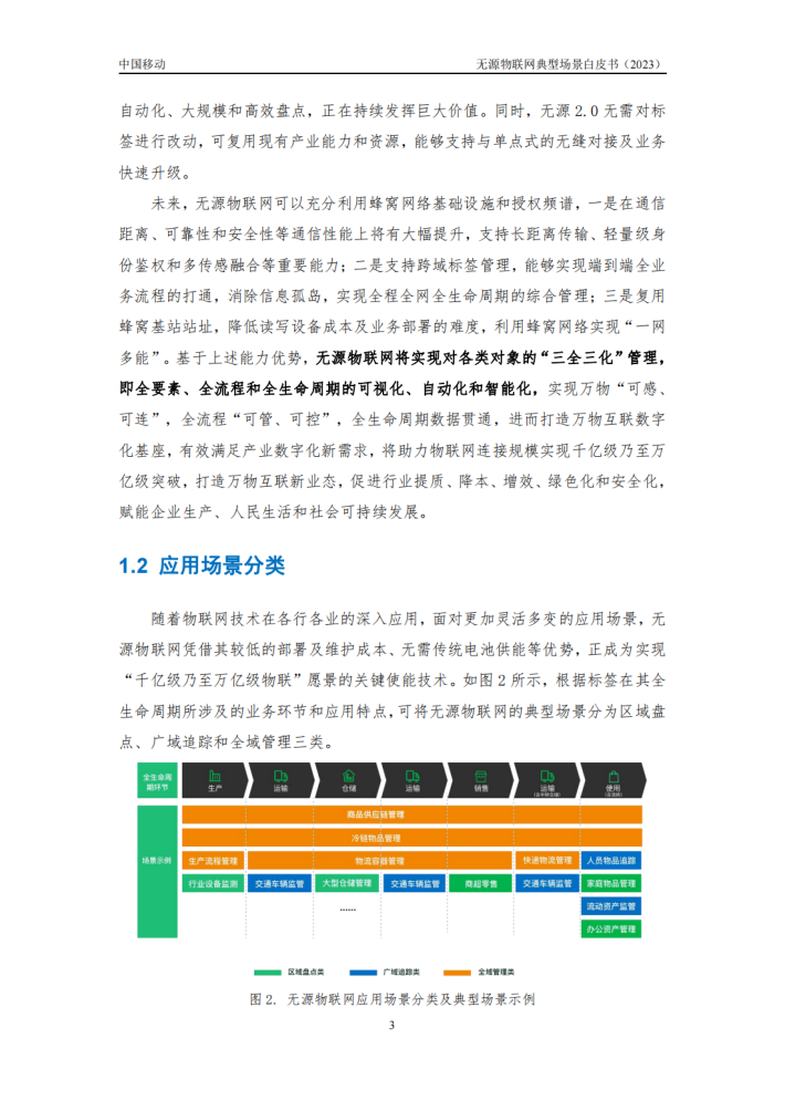 无源物联网具备低成本、低功耗、易部署和免维护等优势,通过架构创新、算法创新和能力创新,将解决现有方案性能受限、场景受限和自动化程度低等问题,能够实现标识对象全要素、全流程和全生命周期的可视化、自动化和智能化(即“三全三化”)管理,进而实现万物智联。本白皮书聚焦无源物联网典型应用场景,根据标识对象全生命周期的特点和能力要求对场景进行分类,并详细阐述每个场景的业务痛点和无源物联网在该场景的适用性及价值,为推动无源物联网技术方案研究及产业发展提供参考。