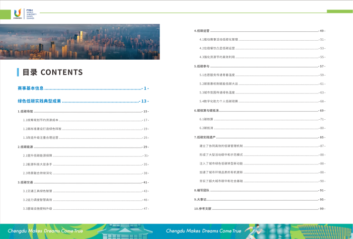 大运会这场万众瞩目的“成都之约”,不仅是成都的,也是四川的,不仅是中国的,更是世界的。本报告系统反映了成都大运会作为绿色低碳办赛践行者、助推低碳生活倡导者、积极应对气候变化参与者的措施及成效,旨在形成大运会绿色低碳实践遗产,让绿色低碳成为一种广泛认同的生产生活方式,同时启发更多国家和地区在举办大型活动时,更加重视生态环境保护和可持续发展,携手共建清洁美丽世界。