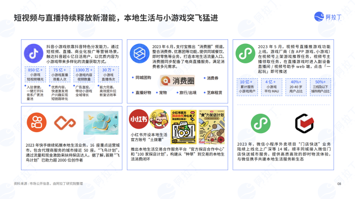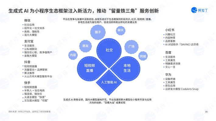 一年以来的行业探索为小程序互联网注入了新的灵感。上半年平台在竞争中形成了对生态框架的阶段性共识,社交、短视频/直播、本地生活这个“铁三角组合”成为留住用户、促进活跃和发展商业的关键业务,而下半年陆续加入的大模型理念又带来更远的畅想空间,使用人工智能重塑软件服务的时代登场。