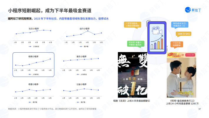 与此同时,成熟应用领域的小程序服务也在经历变革。阿拉丁研究院曾经在上半年白皮书中预测了内容类小程序的爆发,下半年小程序短剧的兴起无疑印证了这一猜想。相信随着人工智能技术的加入,更多创新服务会跟随时代进入用户视野。