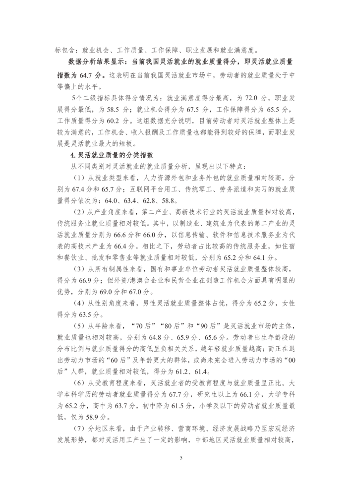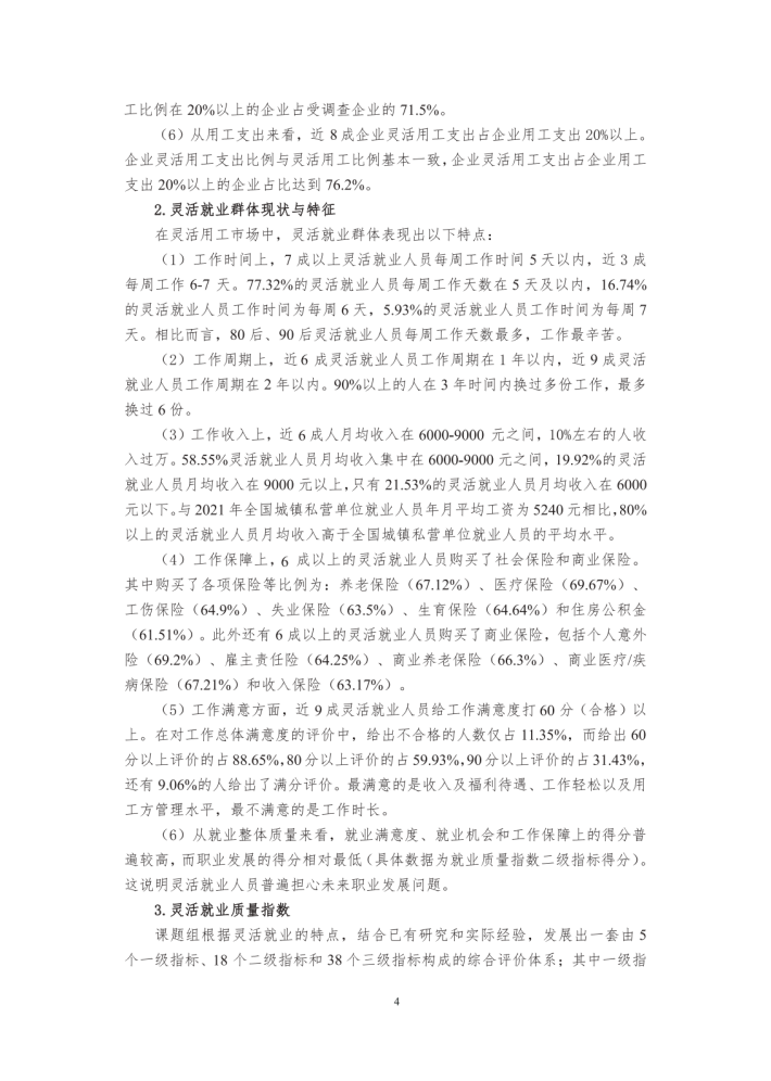 数字技术与工作相互融合正在改变着工作的内容和方式,同时也引发了劳动用工市场的巨大变革。当灵活用工成为互联网平台和传统企业非常重要的用工方式时,灵活就业人员的数量和规模也将会持续扩大。灵活就业对于很多劳动者来说,不再是一种工作的过渡,而成为了他们的重要就业方式。如果数字技术催生的灵活就业仅提供了更多就业机会,而就业质量整体低下的话,那么就难以符合国家增进民生福祉的愿景目标与就业优先战略。为此课题组基于问卷调查数据,对灵活就业质量就行了深入的分析和论证。