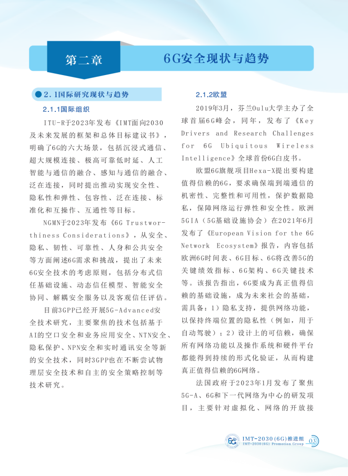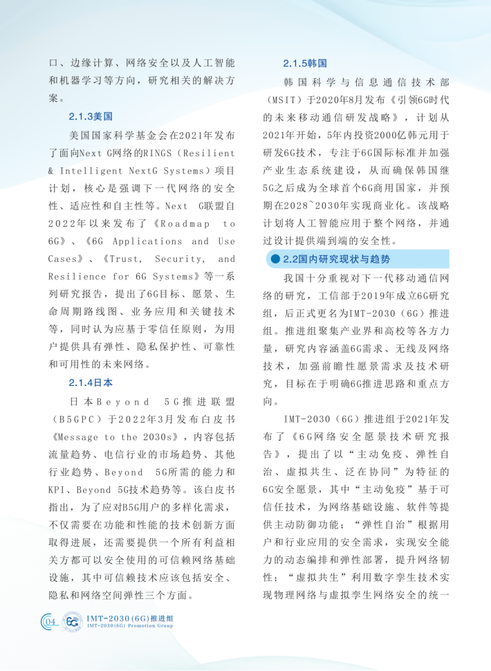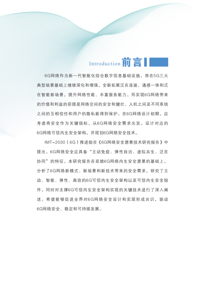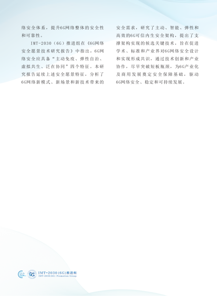 IMT-2030(6G)推进组在《6G网络安全愿景技术研究报告》中提出,6G网络安全应具备“主动免疫、弹性自治、虚拟共生、泛在协同”的特征。本研究报告在延续6G网络内生安全愿景的基础上,分析了6G网络新模式、新场景和新技术带来的安全需求,研究了主动、智能、弹性、高效的6G可信内生安全架构以及可信内生安全组件,同时对支撑6G可信内生安全架构实现的关键技术进行了深入阐述。希望能够促进业界对6G网络安全设计和实现形成共识,驱动6G网络安全、稳定和可持续发展。