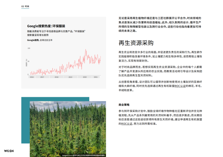这份白皮书涵盖WGSN所服务的每个行业的独特需求,包括美妆、科技消费品、时尚、食品&饮料以及室内设计,重点介绍了负责型产品开发流程的六大核心支柱,即采购、设计、生产、分配、消费和购后。我们还在附录中增加了WGSN内部使用的环保术语汇编,作为开源的教育型工具供所有人使用,帮助人们理解晦涩、复杂的术语。