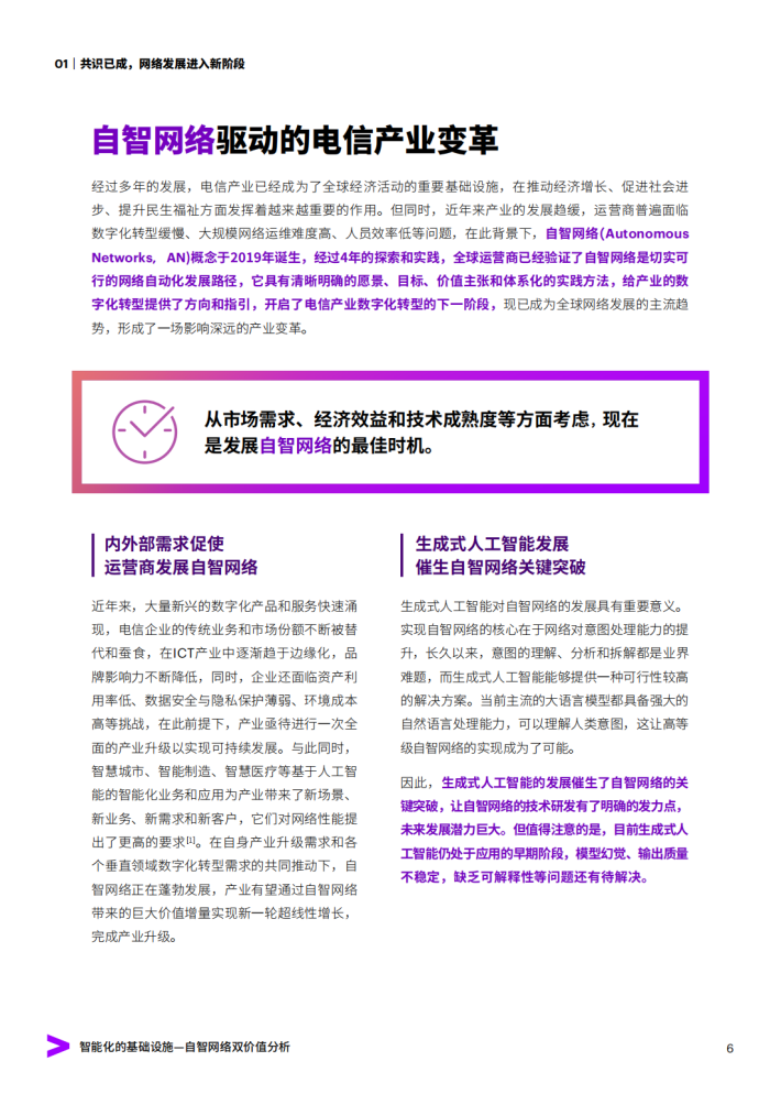 本报告旨在分析和评估自智网络能够创造的价值规模,更全面、系统地阐述自智网络的价值,针对商业价值和社会价值进行分析和总结,明确和强化自智网络的价值共识。研究的意义不仅在于推广自智网络,更在于从价值的视角出发,向读者呈现自智网络对商业、社会将产生的深远影响和其所蕴含的巨大价值增长潜力。