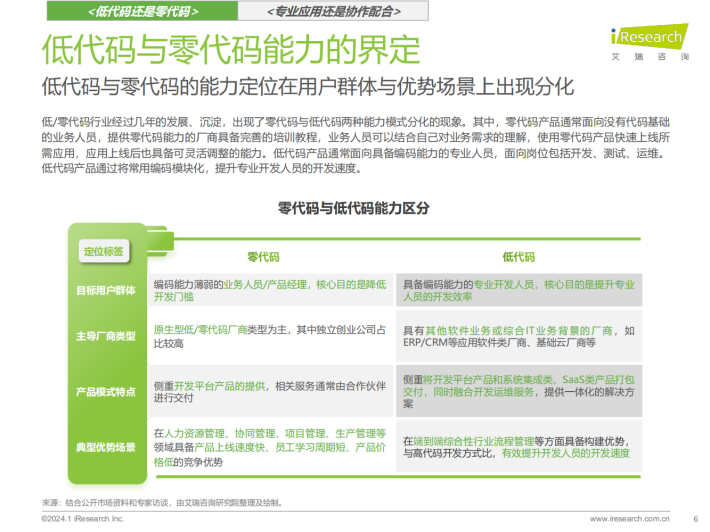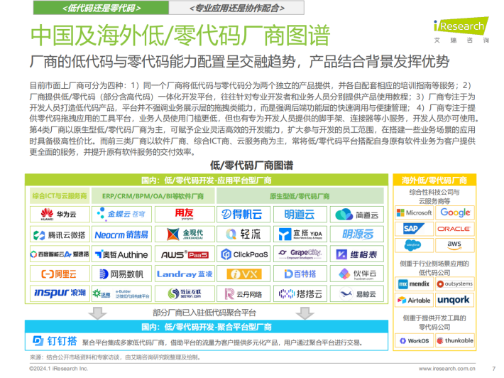逐新的,低代码和零代码的能力定位出现分化:零代码的核心作用是降低开发门槛,短培训周期即可让业务人员/产品经理搭建自己的应用,适合中长尾的企业应用搭建需求。低代码的核心价值是提升专业开发人员的效率,更便捷的调用多种能力的接口,适合T能力强、IT背景复杂的企业使用。