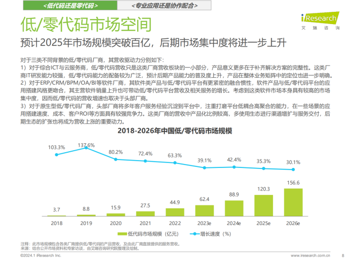 尽管产品的能力出现了分化,厂商在产品能力的配置上却是融合趋势:一个低/零低代码厂商提供的应用开发平台两种能力均有涉及,但组合的程度不同,综合ICT类、ERP/CRM/BPM等软件类、云服务类背景的厂商平台能力以低代码为主,同时侧重开发平台与自己原有软件业务融合,提供较为综合的解决方案。原生型低/零代码厂商,零代码的能力更强,沉淀的模板、开发组件,在一些应用开发的场景中性价比优势极高,并能较快产生规模化收益。预计2023年低/零代码市场规模在62.4亿元,并在2025年冲破百亿。
