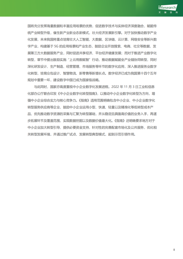 在延续以往研究的基础上,《中国数字经济发展研究报告(2020年)》首次将数字经济组成部分扩展为“四化”——即数字经济包含数字产业化、产业数字化、数据价值化及数字化治理。其中产业数字化是数字经济发展的主阵地,是指传统产业应用数字经济所带来的生产数量和效率的提升。2022年我国产业数字化增加值达到41万亿元,占GDP比重达到33.9%,其增速远高于同期GDP增速。各类传统产业跟随互联网热潮,利用数字技术进行多角度、全链条的全面改造提升,并逐步形成由单点改造向产业集群协同升级的趋势。