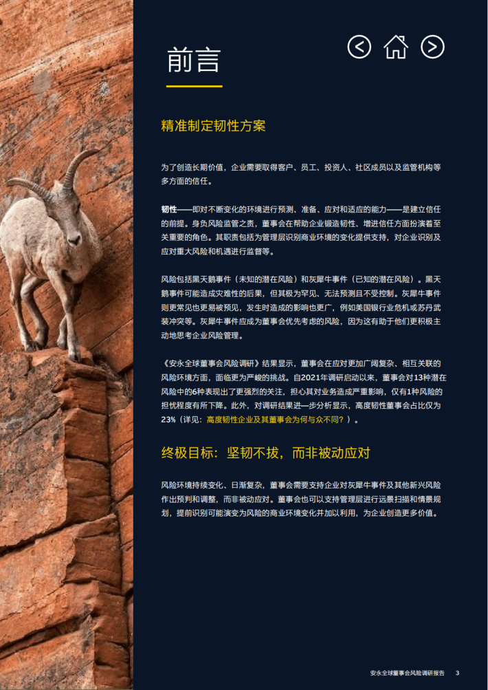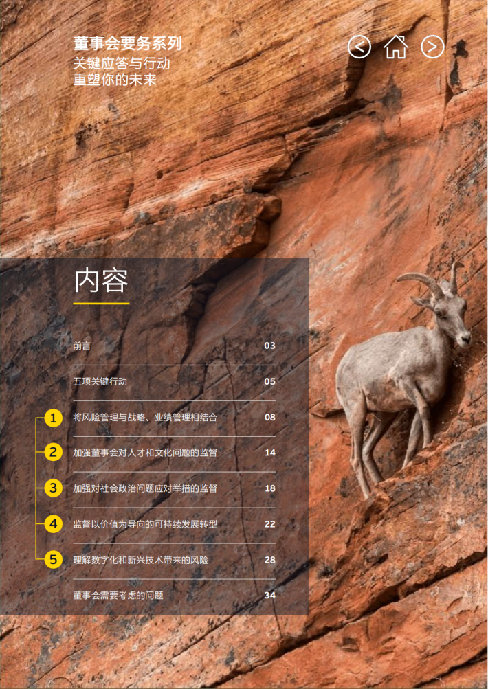风险环境持续变化、日渐复杂,董事会需要支持企业对灰犀牛事件及其他新兴风险作出预判和调整,而非被动应对。董事会也可以支持管理层进行远景扫描和情景规划,提前识别可能演变为风险的商业环境变化并加以利用,为企业创造更多价值。