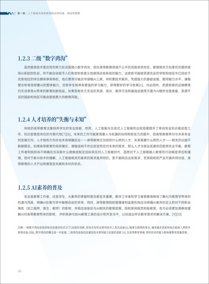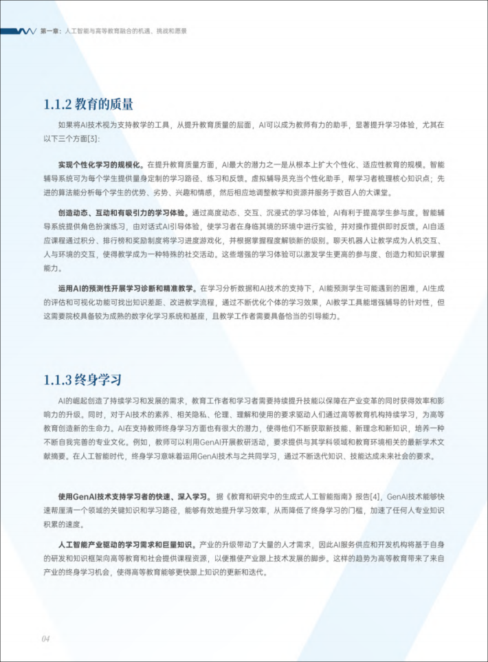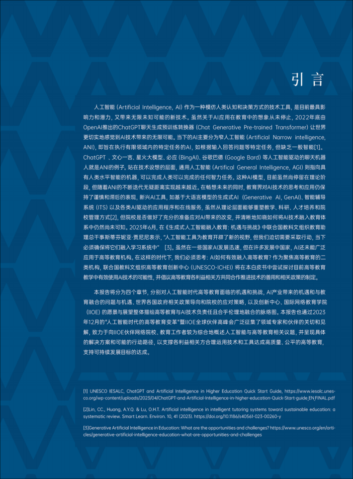 本报告将分为四个章节,分别对人工智能时代高等教育面临的机遇和挑战,AI产业带来的机遇和与教育融合的问题与机遇、世界各国政府相关政策导向和院校的应对策略,以及创新中心、国际网络教育学院(IIOE)的愿景与展望整体描绘高等教育与Al技术负责任且合乎伦理地融合的脉络图。本报告也通过2023年12月的“人工智能时代的高等教育变革“暨IOE全球伙伴高峰会广泛征集了领域专家和伙伴的关切和见解,致力于向IIOE伙伴网络院校、教育工作者较为综合地概述人工智能与高等教育相关议题,并呈现具体的解决方案和可能的行动路径,以支撑各利益相关方合理运用技术和工具达成高质量、公平的高等教育,支持可持续发展目标的达成。