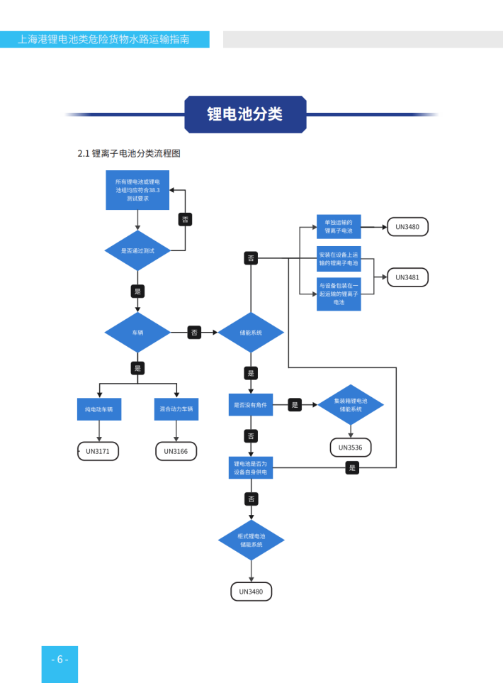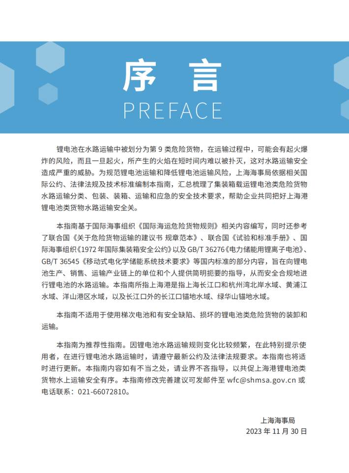 锂电池在水路运输中被划分为第9类危险货物,在运输过程中,可能会有起火爆炸的风险,而且一旦起火,所产生的火焰在短时间内难以被扑灭,这对水路运输安全造成严重的威胁。为规范锂电池运输和降低锂电池运输风险,上海海事局依据相关国际公约、法律法规及技术标准编制本指南,汇总梳理了集装箱载运锂电池类危险货物水路运输分类、包装、装箱、运输和应急的安全技术要求,帮助企业共同把好上海港锂电池类货物水路运输安全关。