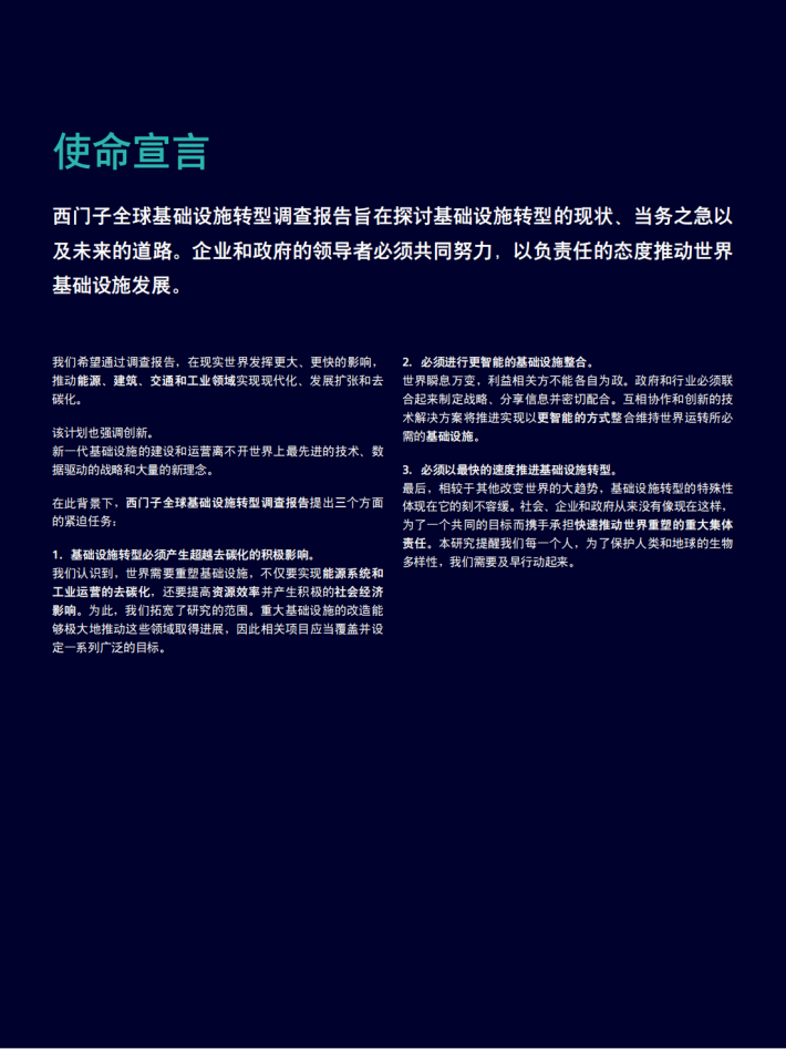 西门子全球基础设施转型调查报告旨在探讨基础设施转型的现状、当务之急以及未来的道路。企业和政府的领导者必须共同努力,以负责任的态度推动世界基础设施发展。
