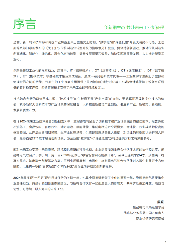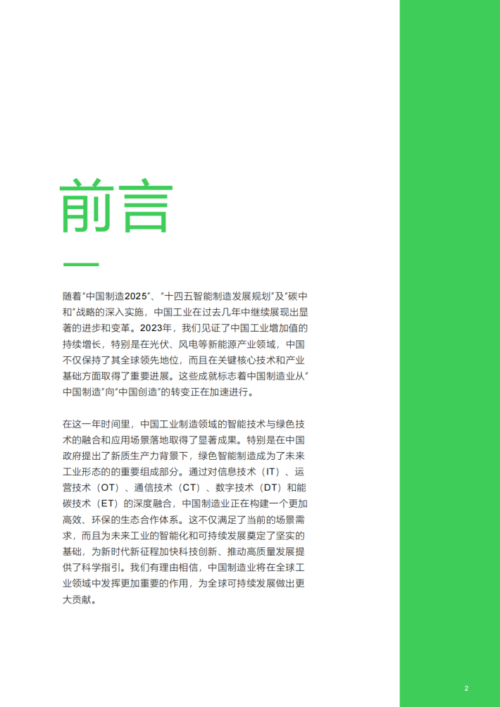 在这一年时间里,中国工业制造领域的智能技术与绿色技术的融合和应用场景落地取得了显著成果。特别是在中国政府提出了新质生产力背景下,绿色智能制造成为了未来工业形态的的重要组成部分。通过对信息技术(IT)、运营技术(OT)、通信技术(CT)、数字技术(DT)和能碳技术(ET)的深度融合,中国制造业正在构建一个更加高效、环保的生态合作体系。这不仅满足了当前的场景需求,而且为未来工业的智能化和可持续发展奠定了坚实的基础,为新时代新征程加快科技创新、推动高质量发展提供了科学指引。我们有理由相信,中国制造业将在全球工业领域中发挥更加重要的作用,为全球可持续发展做出更大贡献。