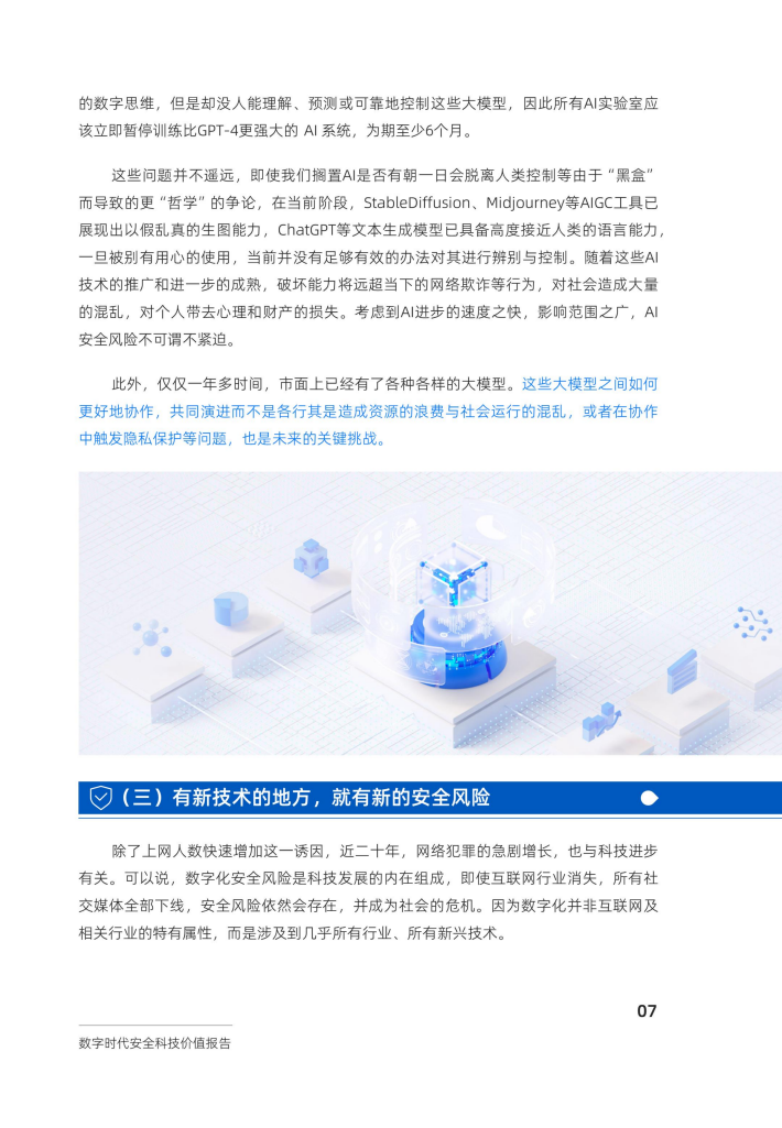 本报告基于2023年全球数字社会的安全风险新形势和科技创新内在逻辑,对安全科技提出“伴生技术”的新定义,总结其具有的“压舱石”与“助燃剂”双重价值,并提出将安全科技视作新型公共产品的新思路。