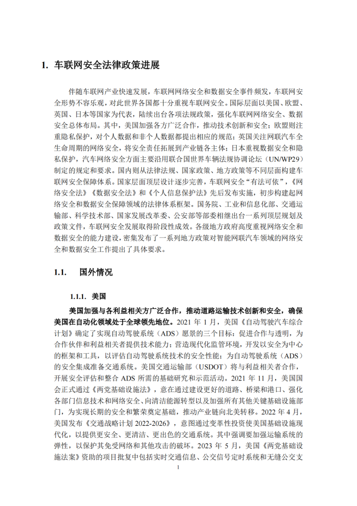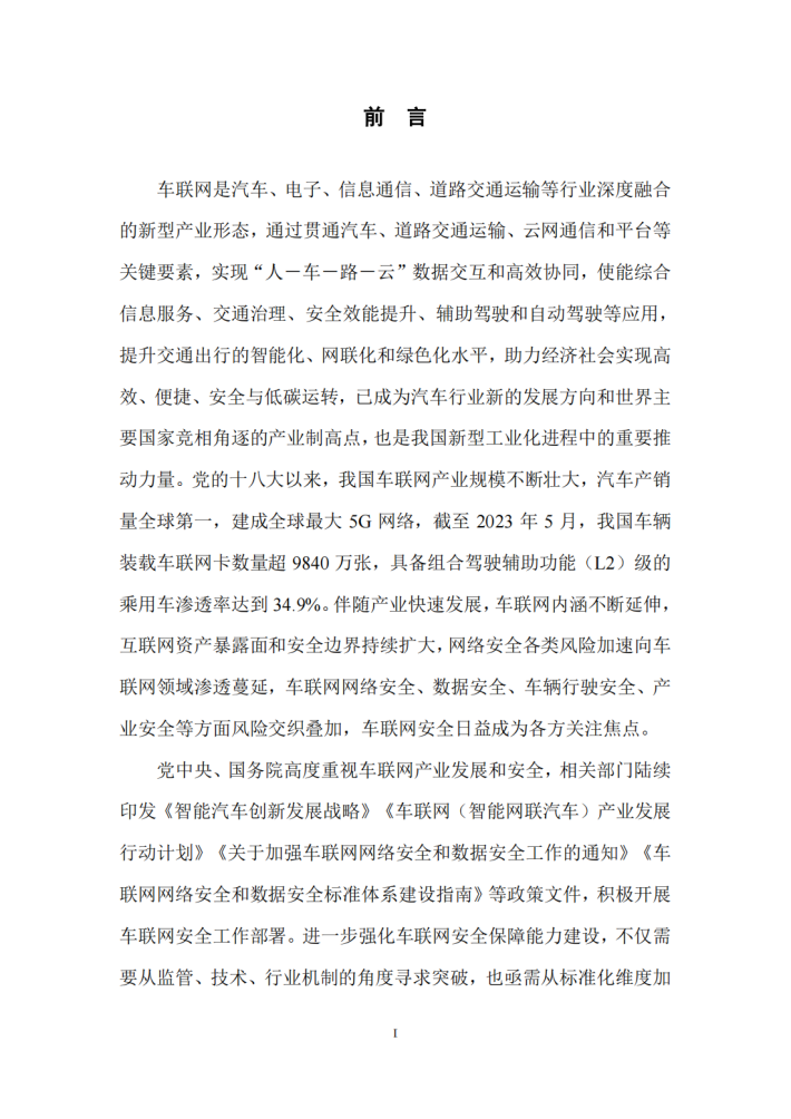 车联网是汽车、电子、信息通信、道路交通运输等行业深度融合的新型产业形态,通过贯通汽车、道路交通运输、云网通信和平台等关键要素,实现“人一车一路一云”数据交互和高效协同,使能综合信息服务、交通治理、安全效能提升、辅助驾驶和自动驾驶等应用,提升交通出行的智能化、网联化和绿色化水平,助力经济社会实现高效、便捷、安全与低碳运转,已成为汽车行业新的发展方向和世界主要国家竞相角逐的产业制高点,也是我国新型工业化进程中的重要推动力量。党的十八大以来,我国车联网产业规模不断壮大,汽车产销量全球第一,建成全球最大5G网络,截至2023年5月,我国车辆装载车联网卡数量超9840万张,具备组合驾驶辅助功能(L2)级的乘用车渗透率达到34.9%。伴随产业快速发展,车联网内涵不断延伸,互联网资产暴露面和安全边界持续扩大,网络安全各类风险加速向车联网领域渗透蔓延,车联网网络安全、数据安全、车辆行驶安全、产业安全等方面风险交织叠加,车联网安全日益成为各方关注焦点。