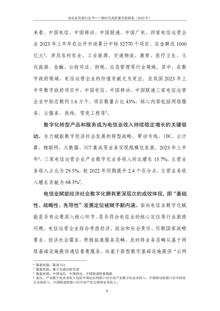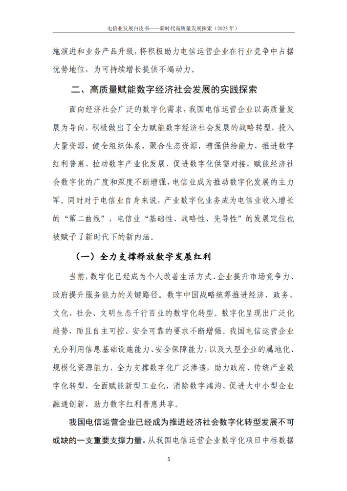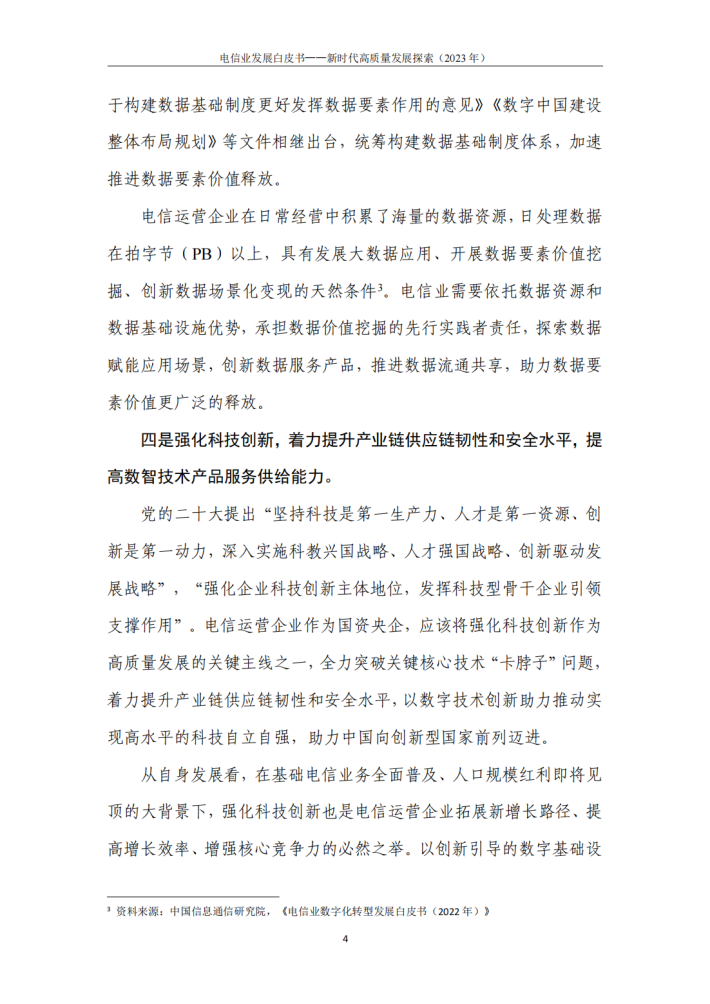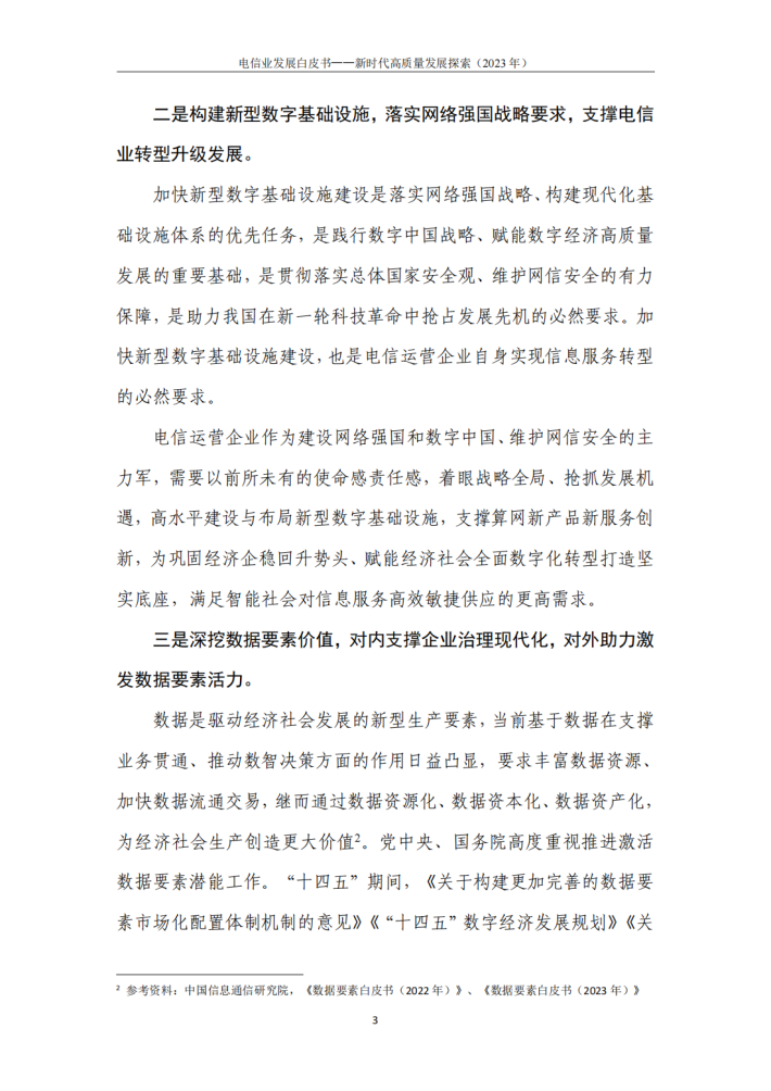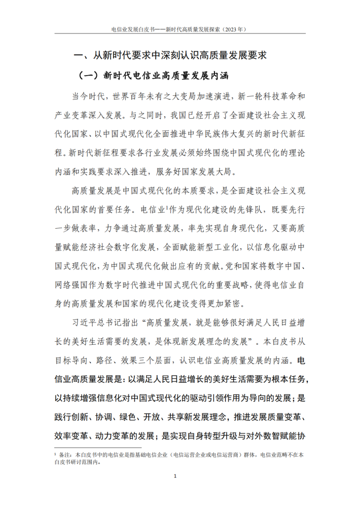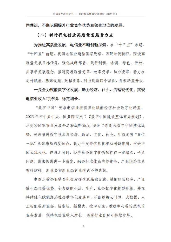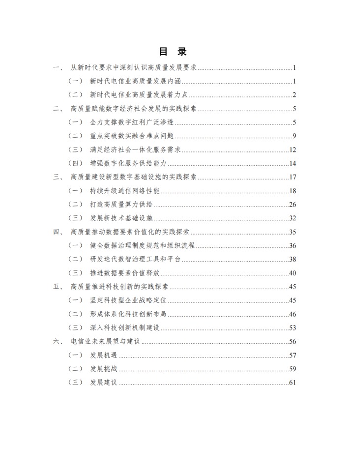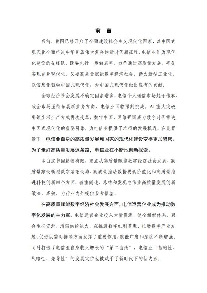 本白皮书因篇幅有限,重点从高质量赋能数字经济社会发展、高质量建设新型数字基础设施、高质量推动数据要素价值化和高质量推进科技创新四个方面,着重阐述、总结和发现电信业高质量发展创新做法、成效,为行业内外提供参考借鉴。