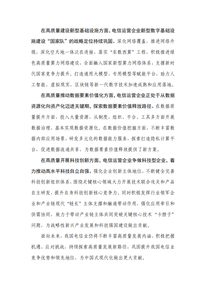 当前,我国已经开启了全面建设社会主义现代化国家、以中国式现代化全面推进中华民族伟大复兴的新时代新征程。电信业作为现代化建设的先锋队,既要先行一步做表率,力争通过高质量发展,率先实现自身现代化,又要高质量赋能数字经济社会,助力新型工业化,以信息化驱动中国式现代化,为中国式现代化做出应有的贡献。