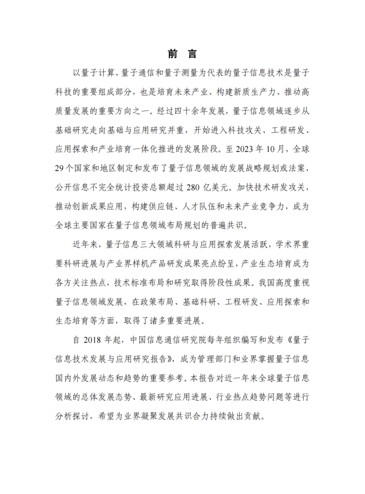 自2018年起,中国信息通信研究院每年组织编写和发布《量子信息技术发展与应用研究报告》,成为管理部门和业界掌握量子信息国内外发展动态和趋势的重要参考。本报告对近一年来全球量子信息领域的总体发展态势、最新研究应用进展、行业热点趋势问题等进行分析探讨,希望为业界凝聚发展共识合力持续做出贡献。
