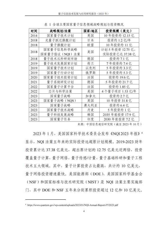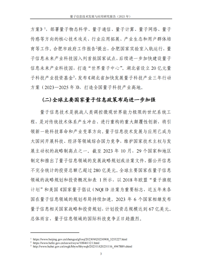 以量子计算、量子通信和量子测量为代表的量子信息技术是量子科技的重要组成部分,也是培育未来产业、构建新质生产力、推动高质量发展的重要方向之一。经过四十余年发展,量子信息领域逐步从基础研究走向基础与应用研究并重,开始进入科技攻关、工程研发、应用探索和产业培育一体化推进的发展阶段。至2023年10月,全球29个国家和地区制定和发布了量子信息领域的发展战略规划或法案,公开信息不完全统计投资总额超过280亿美元。加快技术研发攻关,推动创新成果应用,构建供应链、人才队伍和未来产业竞争力,成为全球主要国家在量子信息领域布局规划的普遍共识。