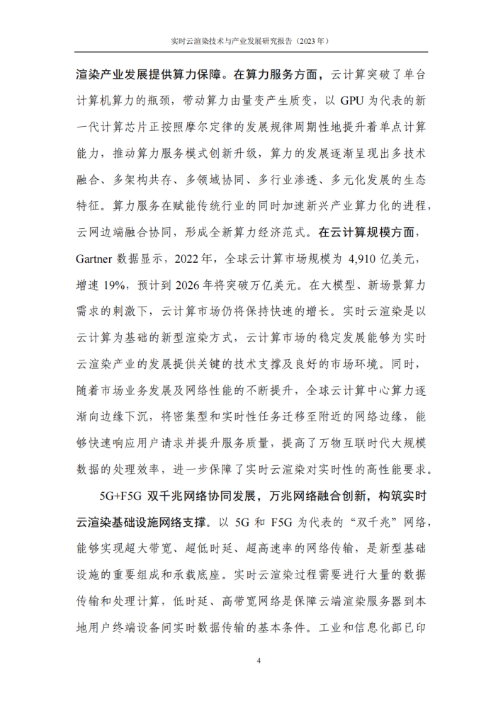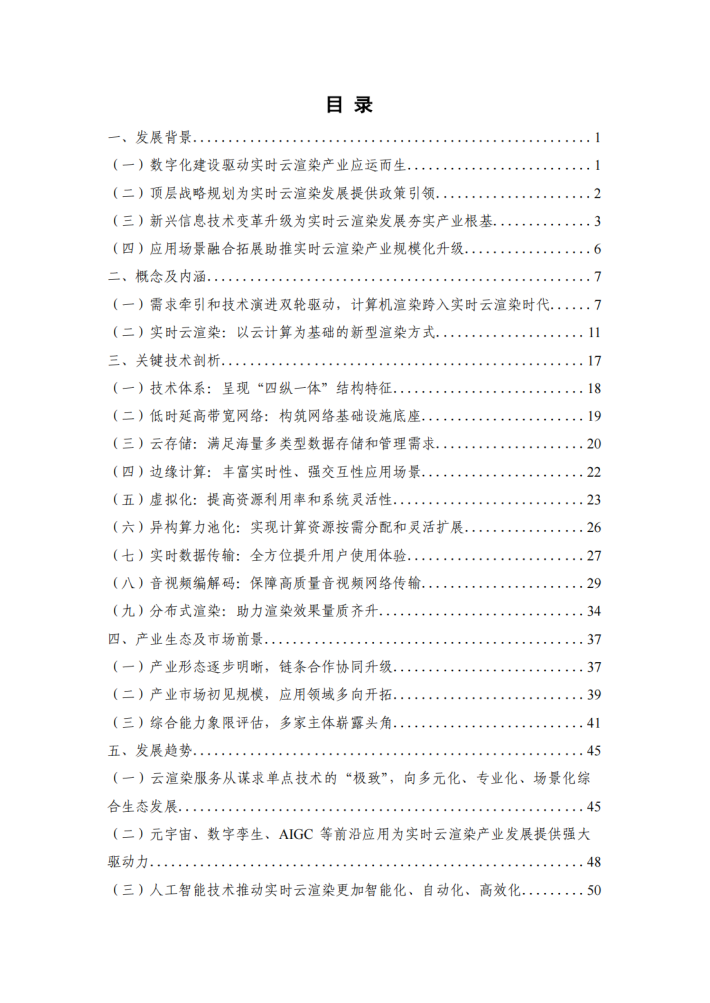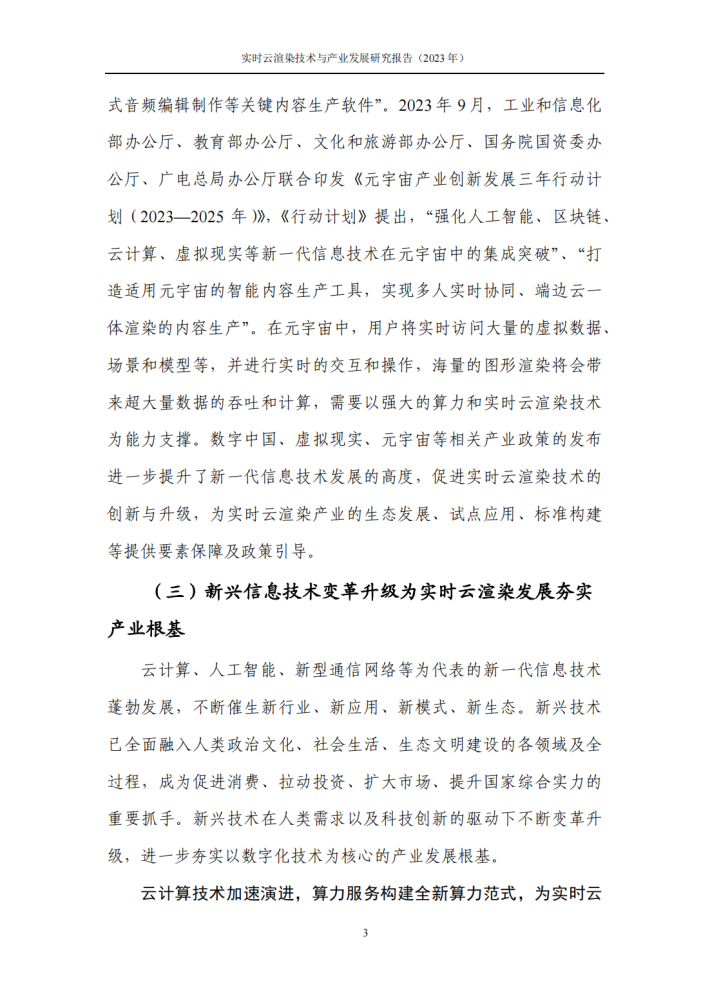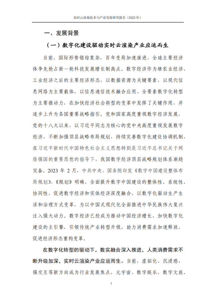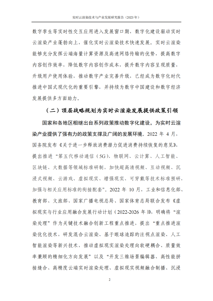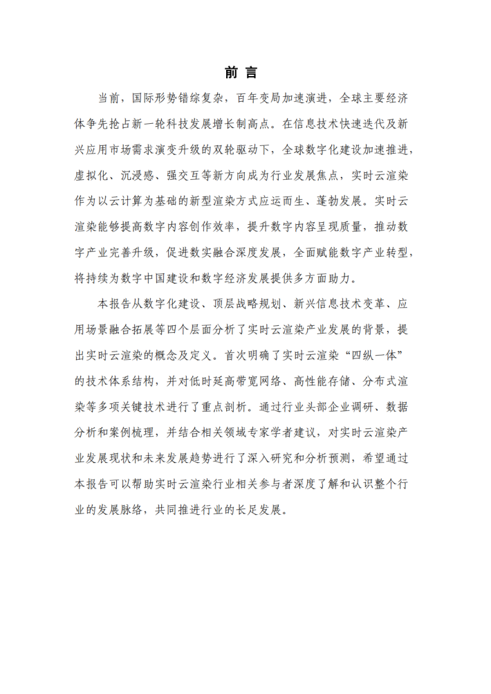 当前,国际形势错综复杂,百年变局加速演进,全球主要经济体争先抢占新一轮科技发展增长制高点。在信息技术快速迭代及新兴应用市场需求演变升级的双轮驱动下,全球数字化建设加速推进,虚拟化、沉浸感、强交互等新方向成为行业发展焦点,实时云渲染作为以云计算为基础的新型渲染方式应运而生、蓬勃发展。实时云渲染能够提高数字内容创作效率,提升数字内容呈现质量,推动数字产业完善升级,促进数实融合深度发展,全面赋能数字产业转型,将持续为数字中国建设和数字经济发展提供多方面助力。