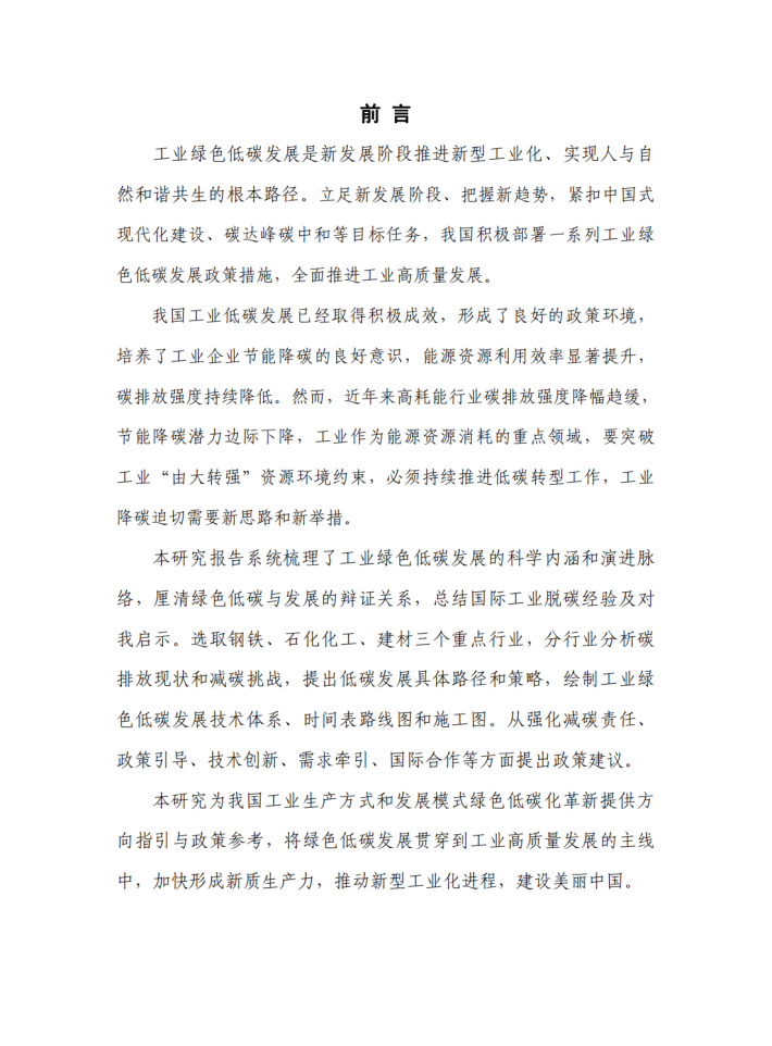 本研究报告系统梳理了工业绿色低碳发展的科学内涵和演进脉络,厘清绿色低碳与发展的辩证关系,总结国际工业脱碳经验及对我启示。选取钢铁、石化化工、建材三个重点行业,分行业分析碳排放现状和减碳挑战,提出低碳发展具体路径和策略,绘制工业绿色低碳发展技术体系、时间表路线图和施工图。从强化减碳责任、政策引导、技术创新、需求牵引、国际合作等方面提出政策建议。