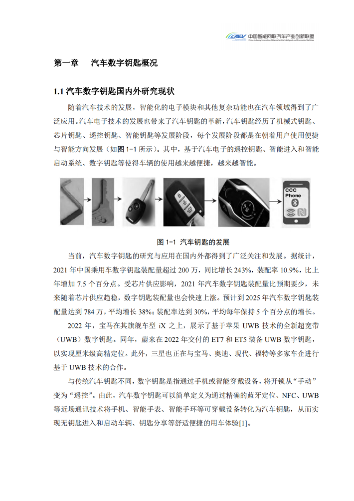 当前,汽车数字钥匙的研究与应用在国内外都得到了广泛关注和发展。据统计,2021年中国乘用车数字钥匙装配量超过200万,同比增长243%,装配率10.9%,比上年增加7.5个百分点。受芯片供应影响,2021年汽车数字钥匙装配量比预期要少,未来随着芯片供应趋稳,数字钥匙装配量也会快速上涨。预计到2025年汽车数字钥匙装配量达到784万,平均增长38%;装配率达到30%,平均每年保持5个百分点的增长。2022年,宝马在其旗舰车型iX之上,展示了基于苹果UWB技术的全新超宽带(UWB)数字钥匙。同年,蔚来在2022年交付的ET7和ET5装备UWB数字钥匙,以实现厘米级高精定位。此外,三星也正在与宝马、奥迪、现代、福特等多家车企进行基于UWB技术的合作。