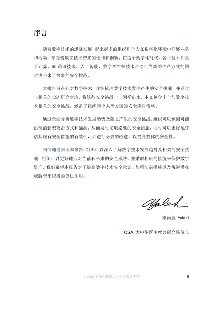 相信通过阅读本报告,组织可以深入了解数字技术发展趋势及相关的安全挑战,组织可以更好地应对当前和未来的安全威胁,并采取相应的措施来保护数字资产。我们希望本报告对于提高数字技术安全意识、加强防御措施以及规避潜在威胁带来积极的促进作用。