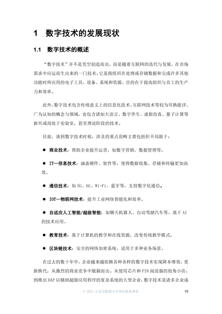 本报告旨在针对数字技术,详细梳理数字技术发展产生的安全挑战,并通过与相关的CSA研究对应,将这些安全挑战一一列举出来。本文包含十个与数字技术相关的安全挑战,涵盖了组织和个人等方面的安全应对策略。