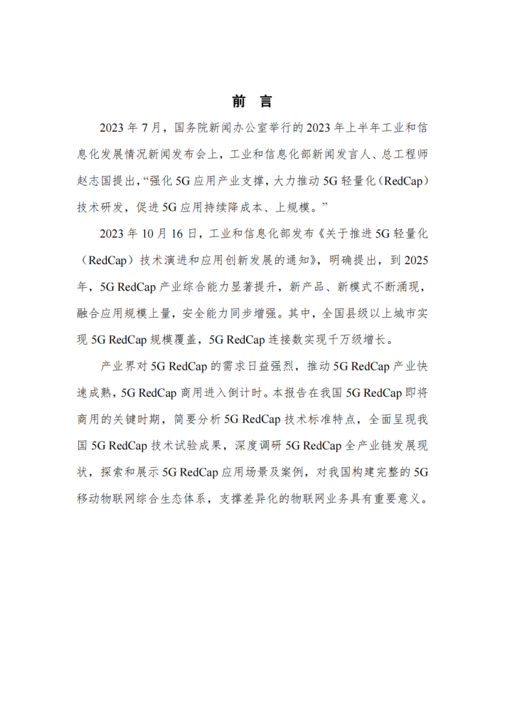 2023年7月,国务院新闻办公室举行的2023年上半年工业和信息化发展情况新闻发布会上,工业和信息化部新闻发言人、总工程师赵志国提出,“强化5G应用产业支撑,大力推动5G轻量化(RedCap)技术研发,促进5G应用持续降成本、上规模。”