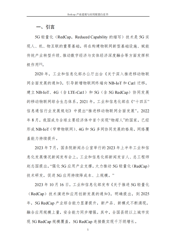 2023年10月16日,工业和信息化部发布《关于推进5G轻量化(RedCap)技术演进和应用创新发展的通知》,明确提出,到2025年,5GRedCap产业综合能力显著提升,新产品、新模式不断涌现,融合应用规模上量,安全能力同步增强。其中,全国县级以上城市实现5G RedCap规模覆盖,5GRedCap连接数实现千万级增长。