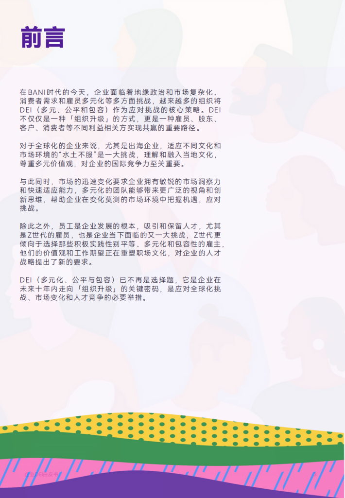 DEI(多元化、公平与包容)已不再是选择题,它是企业在未来十年内走向「组织升级」的关键密码,是应对全球化挑战、市场变化和人才竞争的必要举措。