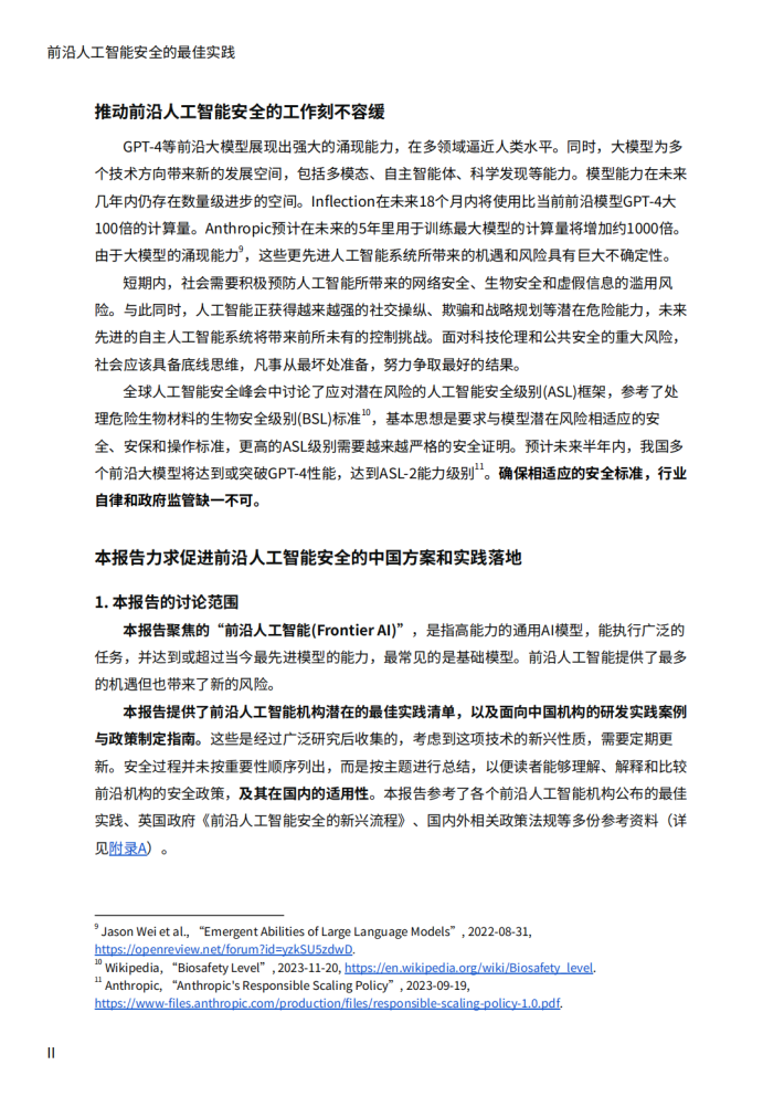 2023年10月26日,联合国秘书长古特雷斯宣布,联合国正式组建一个新的“人工智能高级别咨询机构”²,以探讨这项技术带来的风险和机遇,并为国际社会加强治理提供支持。2023年11月1日,中国、美国在内的28个国家和欧盟,共同签署了《布莱切利人工智能安全宣言》³,一致认为前沿人工智能技术可能会引发巨大风险,尤其是在网络安全、生物技术和加剧传播虚假信息等方面。