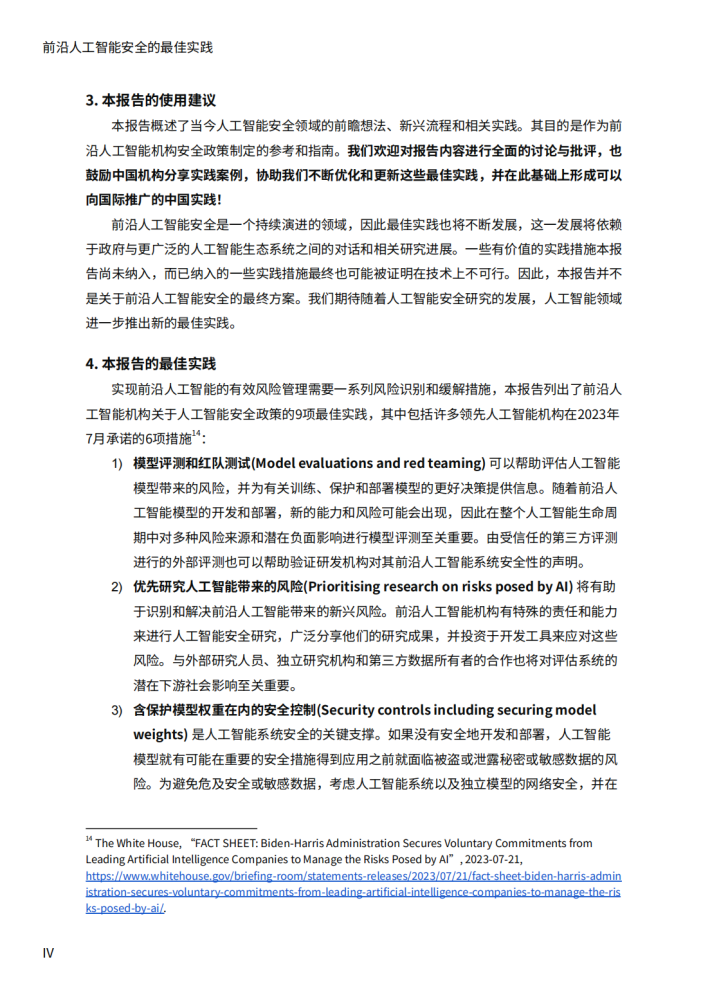 此前的2023年4月28日,中共中央政治局会议明确提出,要重视通用人工智能发展,营造创新生态,重视防范风险。2023年7月10日,国家网信办等七部门联合公布《生成式人工智能服务管理暂行办法》⁵。随着前沿人工智能的快速发展,按照《关于加强科技伦理治理的意见》⁶、《新一代人工智能治理原则》’、《新一代人工智能伦理规范》等治理文件,社会应积极落实对更高级人工智能的潜在风险研判和防范,确保人工智能安全可靠可控,推动经济、社会及生态可持续发展。