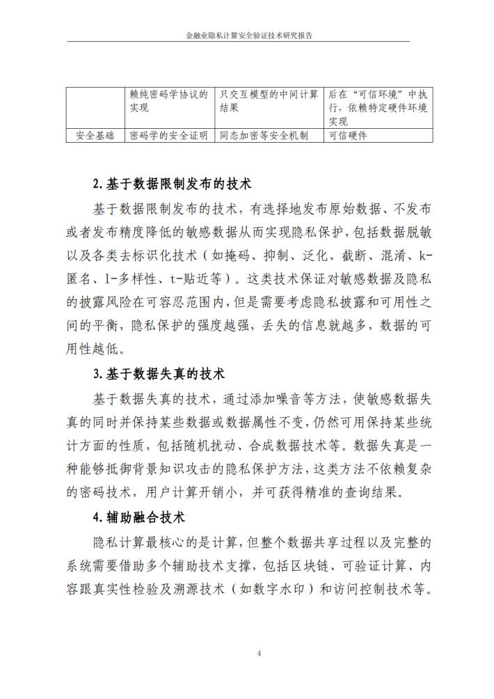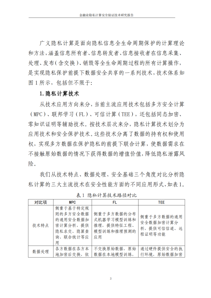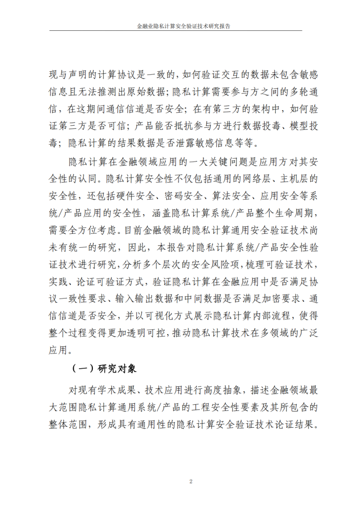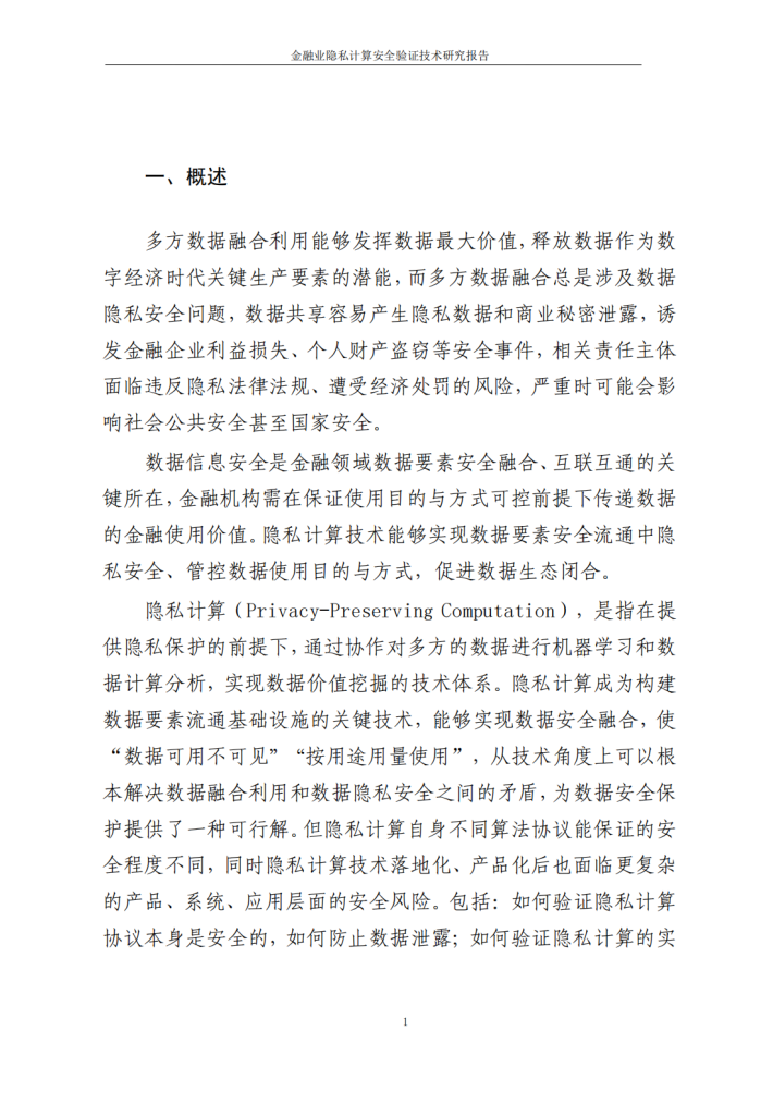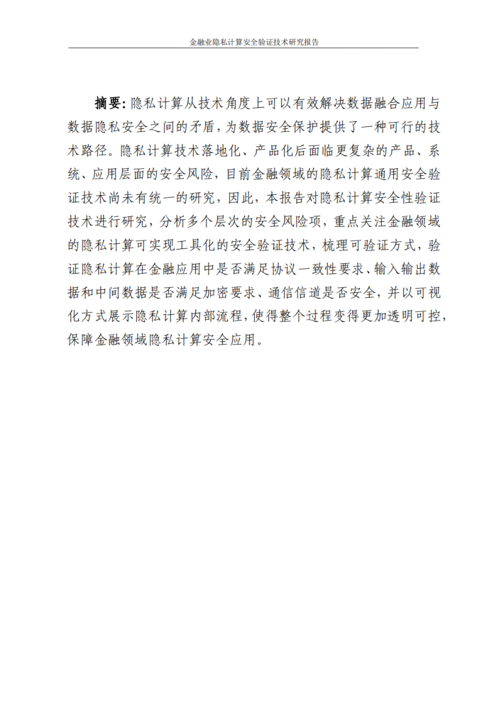 隐私计算从技术角度上可以有效解决数据融合应用与数据隐私安全之间的矛盾,为数据安全保护提供了一种可行的技术路径。隐私计算技术落地化、产品化后面临更复杂的产品、系统、应用层面的安全风险,目前金融领域的隐私计算通用安全验证技术尚未有统一的研究,因此,本报告对隐私计算安全性验证技术进行研究,分析多个层次的安全风险项,重点关注金融领域的隐私计算可实现工具化的安全验证技术,梳理可验证方式,验证隐私计算在金融应用中是否满足协议一致性要求、输入输出数据和中间数据是否满足加密要求、通信信道是否安全,并以可视化方式展示隐私计算内部流程,使得整个过程变得更加透明可控,保障金融领域隐私计算安全应用。