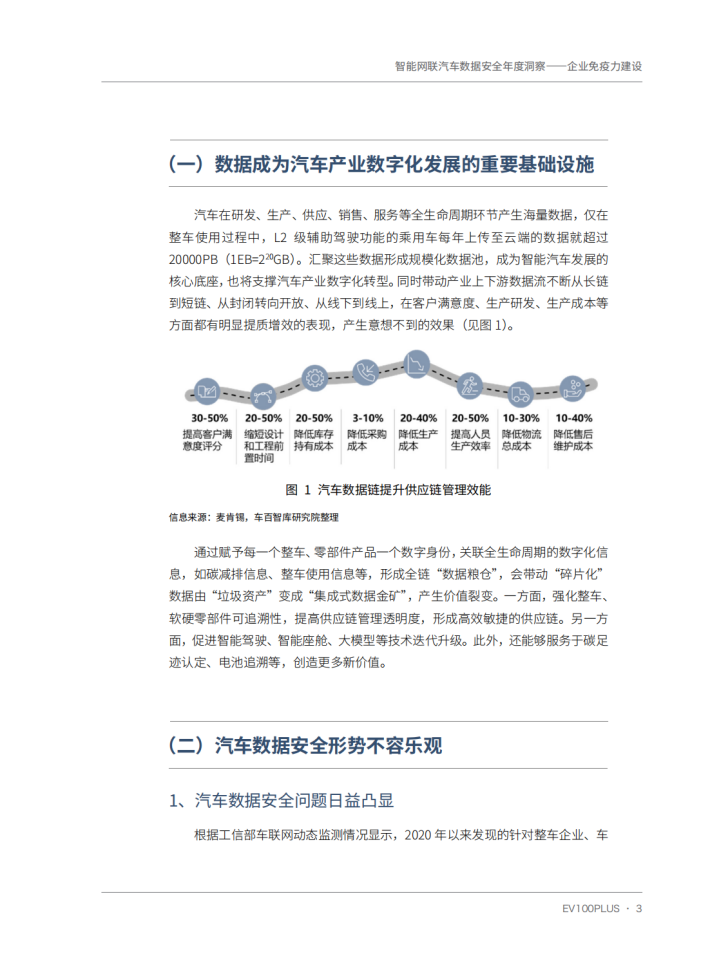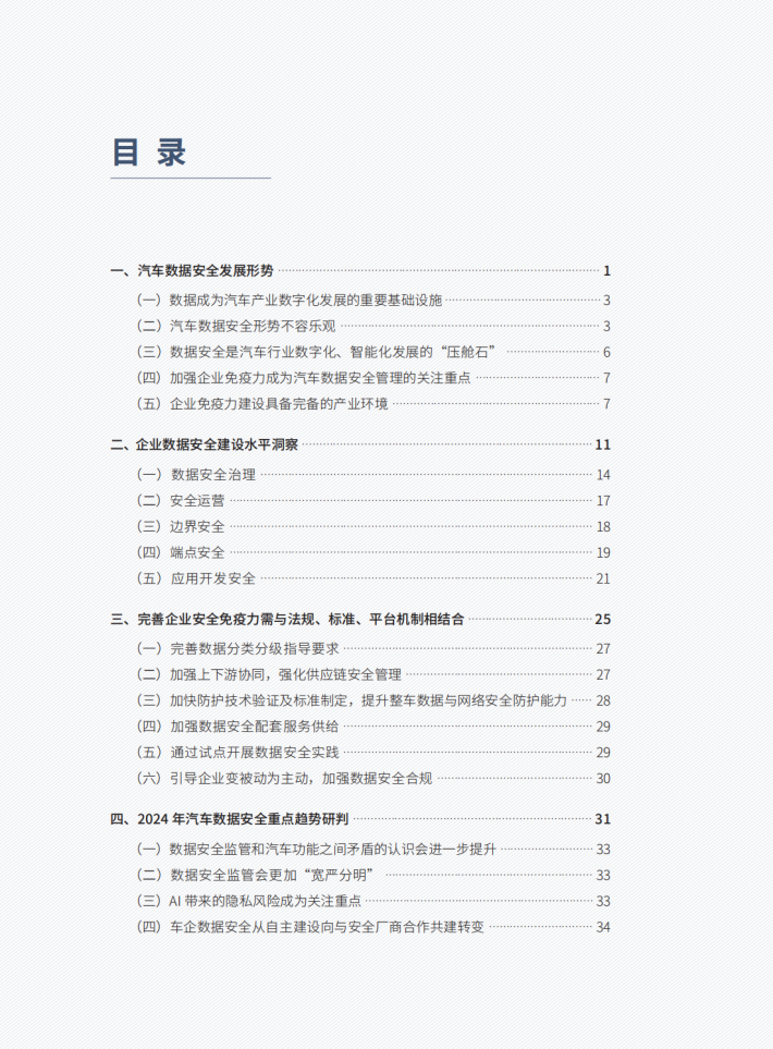 本报告通过专题研究的形式,梳理了汽车数据价值及面临的风险形势,从数据安全治理、安全运营、边界安全、端点安全、应用开发安全等五个方面分析企业数据安全能力水平建设成效及存在的问题,并提出相应建议。