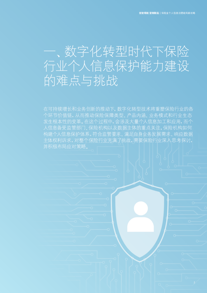 本报告旨在探讨保险行业个人信息保护所面临的难点与挑战,并提出相应的应对策略和思考。首先,报告从监管要求、治理体系、合规共享等方面对个人信息保护形势进行梳理,剖析保险行业中存在的难点与挑战。其次,报告结合业内实践和先进经验,提出在相关领域的思考,并给出应对策略和推进方法。
