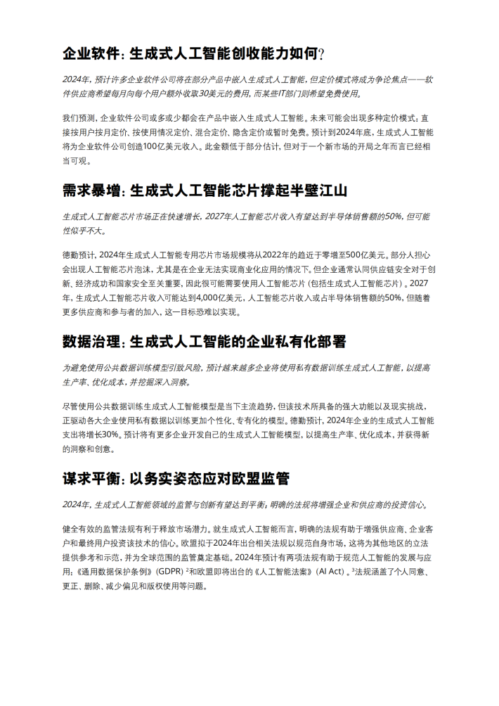生成式人工智能(Gen Al)问世仅一年,便以其强大的图像、视频、代码和文本生成能力颠覆公众的想象力,也引起了商业领袖的注意。2024年当属过渡之年:科技公司正利用生成式人工智能升级软件和服务,业内其他公司亦摩拳擦掌、跃跃欲试。生成式人工智能最初的热潮已然褪去,当务之急是探明其2024年发展趋势。在本报告中,我们将从硬件、软件、服务和监管四个关键角度探讨生成式人工智能。