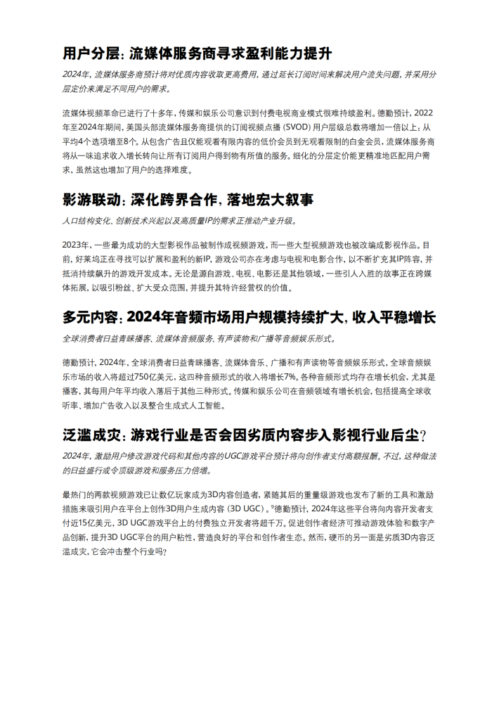 我们在每个篇章都将剖析拥有一定用户基础和受众的技术和内容,及其在盈利甚至创收方面的困境。流媒体服务商或需将重心从抢占市场份额转向提高盈利能力。女子精英赛事(一场可能即将结束的战斗)收入有望在2024年突破十亿美元。嵌入人工智能的软件公司面临如何收回成本的难题,播客公司寻求提高每用户收入,通信设备制造商及服务商则在探索卫星通信服务的收费模式。