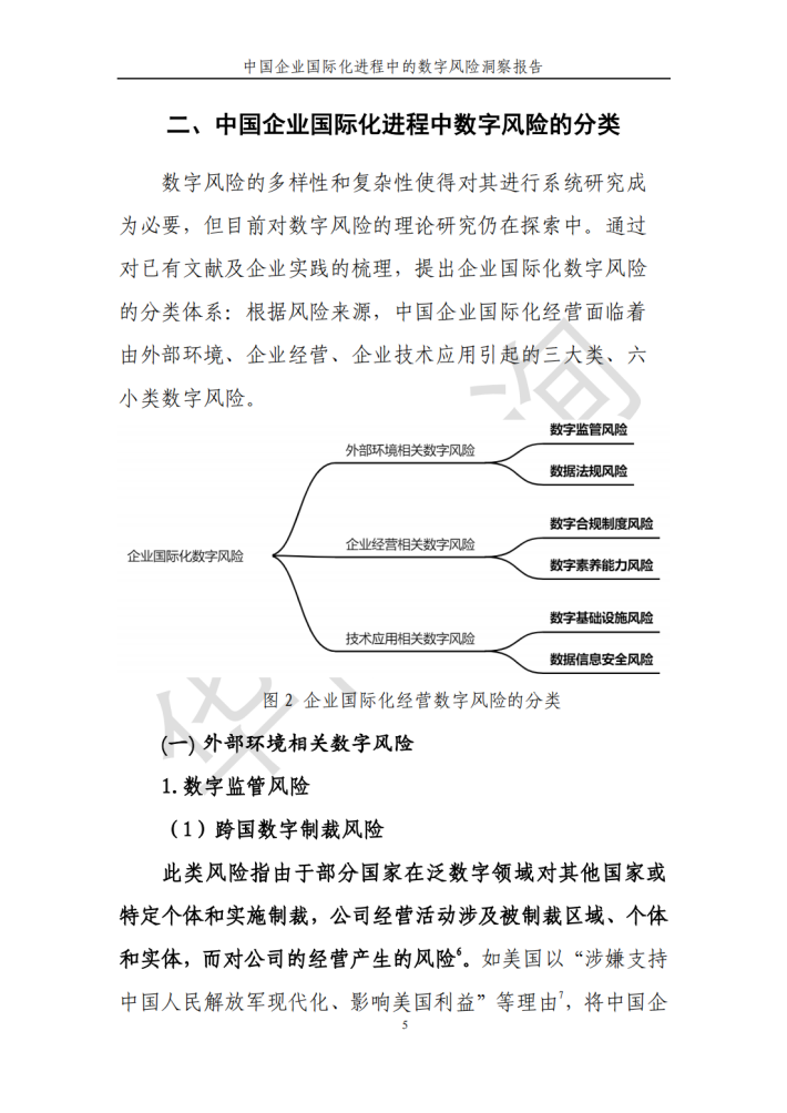数字风险的多样性和复杂性,使得对其进行系统研究成为必要,但目前对数字风险的理论研究仍在探索中,对概念和分类尚未达成共识。通过对已有文献的广泛梳理,我们梳理了来自学术界和业界的最新见解,提出了企业国际化数字风险的分类体系,选取了三家中国企业作为研究标杆,调研梳理其应对数字风险的典型做法。最后,报告就如何提高企业在数字化国际化进程中应对数字风险的能力提出建议。我们期待通过这份报告为业界、学术界以及政策制定者提供分析、应对数字风险的视角和启示,共同推动中国企业在国际市场上的可持续发展。