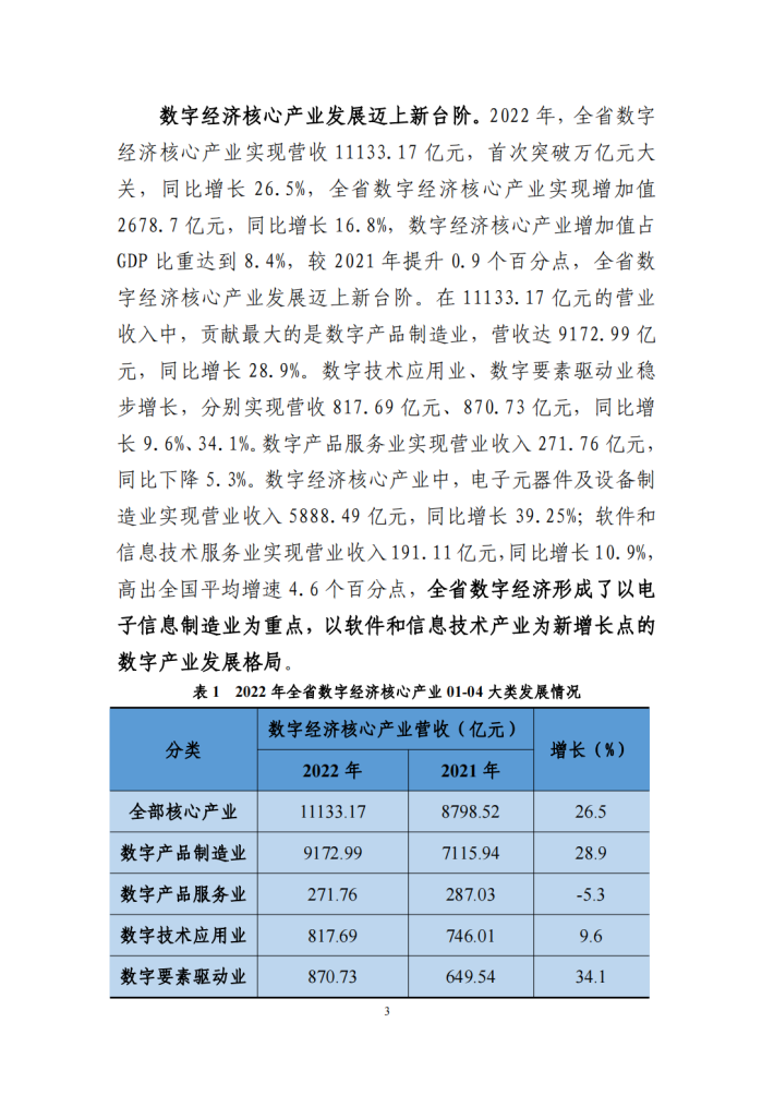 数字经济多项重要指标居全国“第一方阵”。全省电子信息制造业营收由2021年的第7位上升为第4位,电信业务收入增速居全国第5位,网络零售额增速居全国第5位,数字乡村发展水平居全国第10位,智能制造成熟度水平居全国第8位,算力规模居全国第11位,千兆城市数量上升至全国第4位,国家跨境电商综合试验区数量上升至全国第5位,工业互联网标识解析二级节点数量上升至全国第9位。