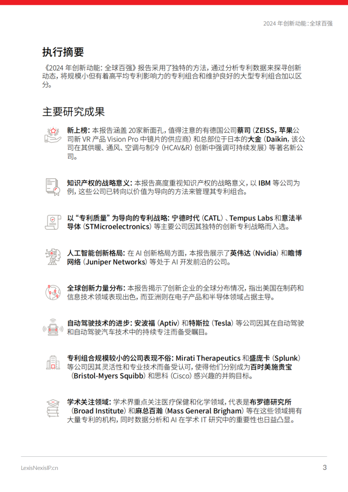 对百强榜的分析揭示了重点企业的一系列引人注目的趋势和合作,让我们了解到推动各行业前进的创新力量。今年的榜单重点关注处于人工智能(Al)开发前沿的公司,这也是IP界的关注焦点和讨论热点,特别是关于Al作为发明人的潜能。此外,本报告还探讨了榜上部分企业的最新并购活动的影响,揭示了相关行业的动态变化。