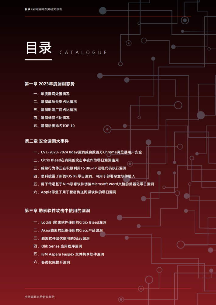 2023年公开漏洞的总数持续上升,类型分布与往年类似,导致实际安全风险的漏洞比例并没有增加,我们还是应该通过威胁情报及时发现那些关键漏洞,以最快的速度加以处置。
