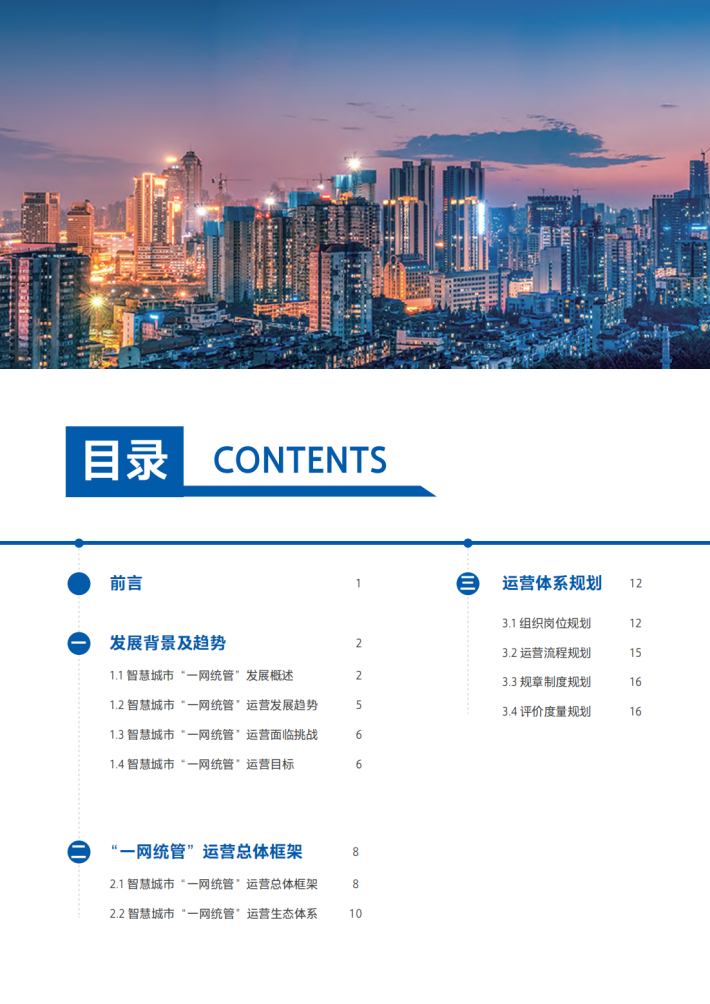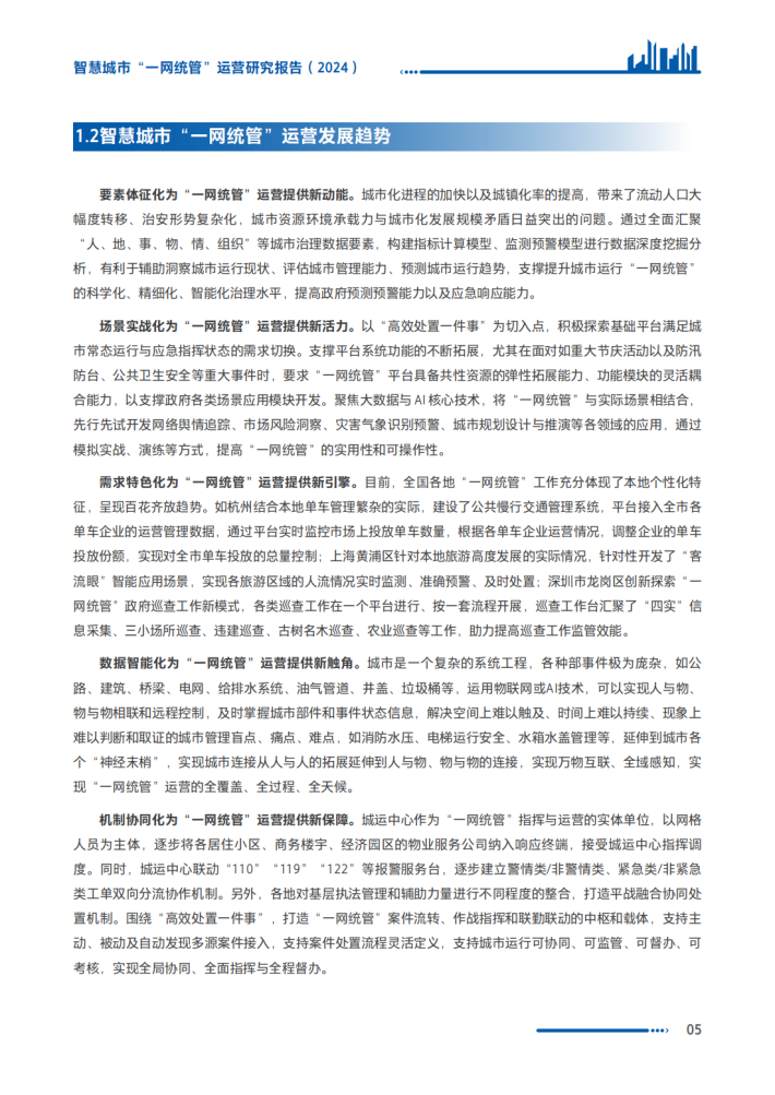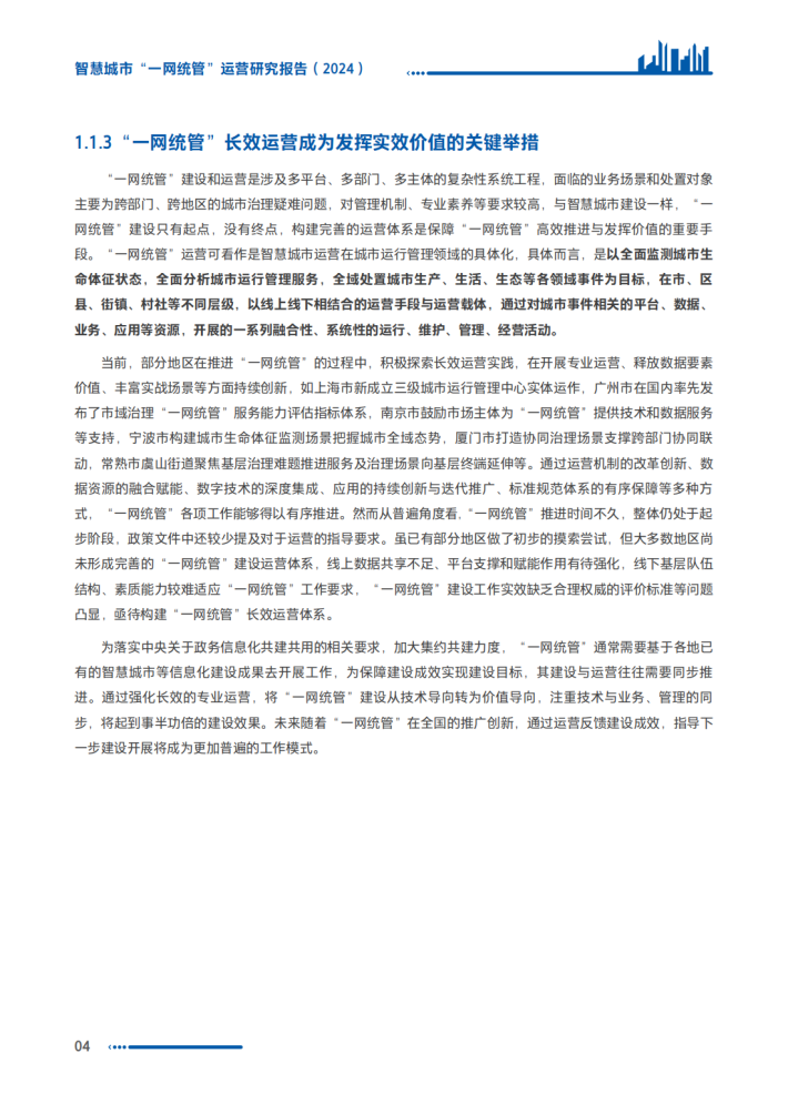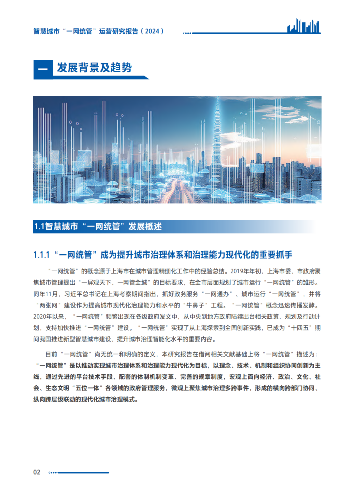 自2020年“一网统管”被上海市率先提出并落地以来,我国各地区积极探索和建设“一网统管”项目,以数字化推进城市治理现代化,并取得了一定成效。为进一步保障“一网统管”的有序建设和长效运营,持续发挥“一网统管”应用成效,在近30家地方主管部门的指导下,全国信标委智慧城市标准工作组组织相关产学研用单位,共同编写形成了《智慧城市“一网统管”运营研究报告2024》(以下简称“研究报告”)。研究报告围绕“一网统管”运营的目标和任务要求,梳理分析了“一网统管”运营的发展背景及趋势,并提出了“一网统管”运营的总体框架,针对“一网统管”运营体系规划、具体运营内容、典型场景运营、运营工具平台等方面提出了相应的实施建议,旨在为各地区开展“一网统管”运营工作提供相关参考与指导,助力智慧城市“一网统管”长效可持续发展。