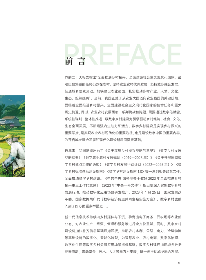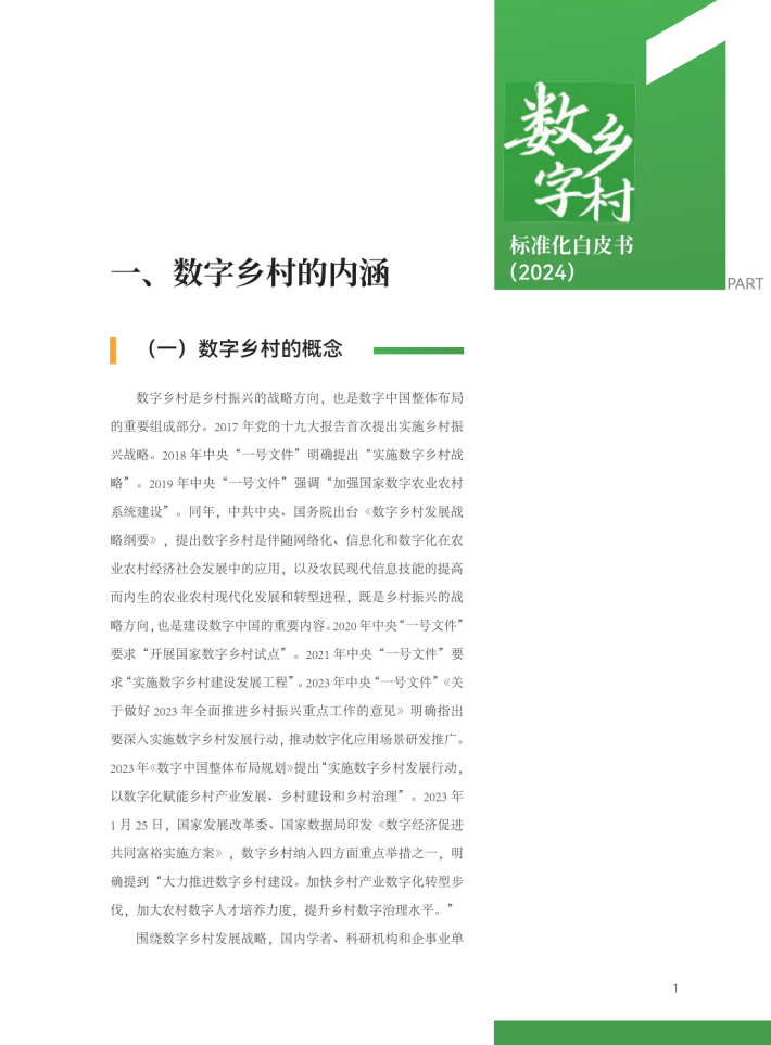 近年来,我国陆续出台了《关于实施乡村振兴战略的意见》《数字乡村发展战略纲要》《数字农业农村发展规划(2019—2025年)》《关于开展国家数字乡村试点工作的通知》《数字乡村发展行动计划(2022—2025年)》《数字乡村标准体系建设指南》《数字乡村建设指南1.0》等一系列相关政策文件,全面推动数字乡村建设。 《中共中央国务院关于做好2023年全面推进乡村振兴重点工作的意见》 (2023年“中央一号文件”)指出要深入实施数字乡村发展行动,推动数字化应用场景研发推广。2023年1月25日,国家发展改革委、国家数据局印发《数字经济促进共同富裕实施方案》,数字乡村也纳入到了四方面重点举措之一。