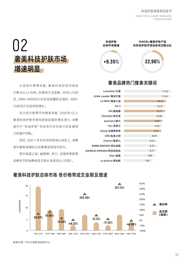 以国内市场为例,虽然科技护肤市场尚未发展成熟,覆盖的产品多元,以“科技感成分”产品为主导的大众市场依然占据总体成交额的47.98%,科学护肤将成为未来的抗老主流形式。