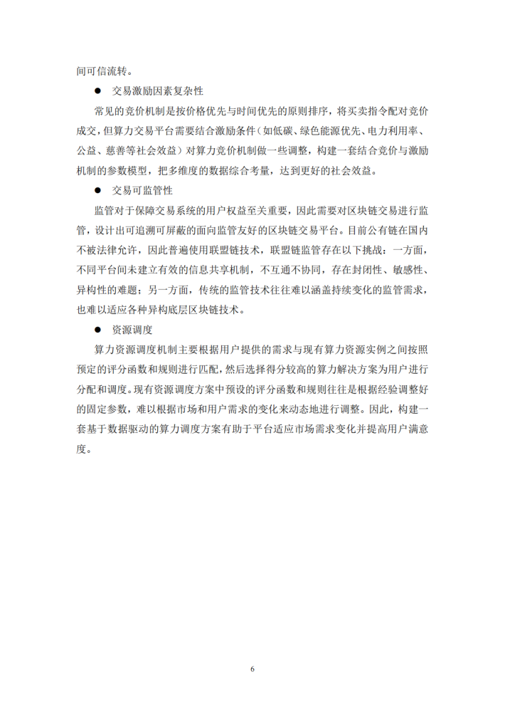 本课题分析了当前算力交易平台的发展现状,总结了算力用户的需求,包括交易效率、交易模式、激励机制、资源调度机制、可监管、数据隐私安全以及行业标准等。针对以上需求,本课题需要研究的关键技术包括区块链、跨链技术、异构联盟链监管技术、数据访问控制、可信交易技术、隐私保护、智能合约、激励机制、资源调度、前沿密码学方法等。本课题的研究内容主要包括(1)基于区块链的算力交易技术; (2)算力交易激励与资源调度机制; (3)面向监管友好的算力交易数据隐私安全。研究目标是构建面向算力并网的高性能区块链算力交易平台,实现高效的算力交易方法、安全灵活的交易模式、多维度激励机制、合理的资源调度、可监管以及符合行业标准的技术方案。