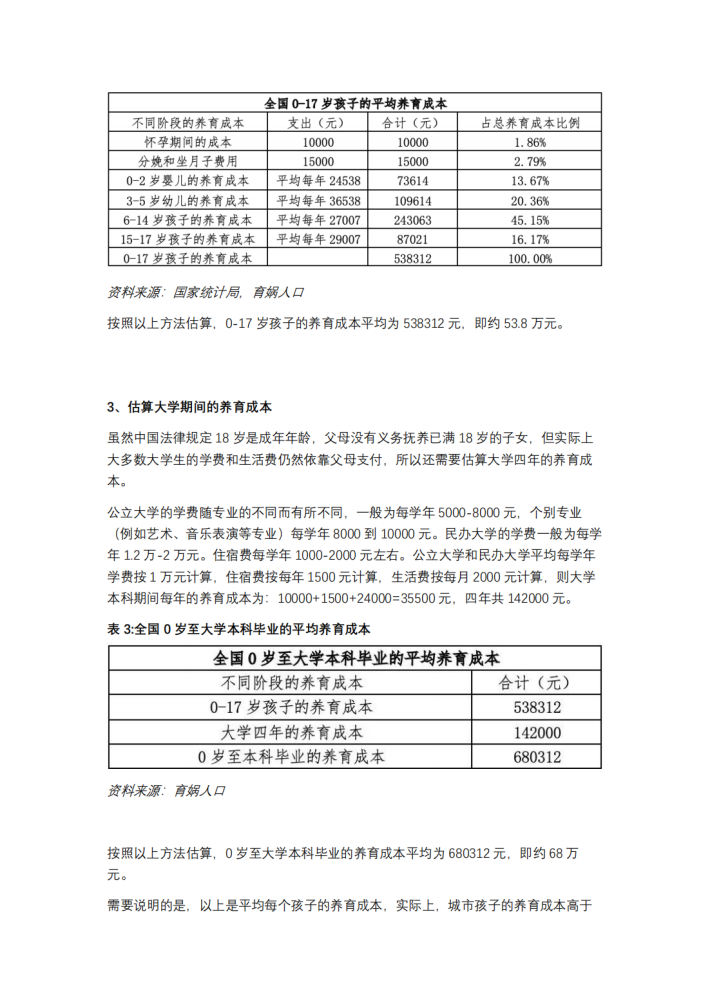 本报告所称的“生育成本”,既包括从怀孕到分娩的成本(即“生的成本”),也包括养育和教育成本(即“育的成本”)。其中“育的成本”占了大头,“生的成本”仅占很小一部分。此外,生育成本还包括时间成本和机会成本。在本报告中,“生育成本”与“养育成本”是作为同义词使用。